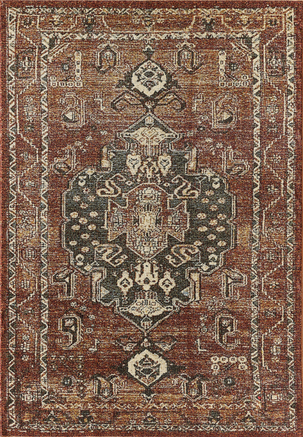 The Mesa orange rust medallion distressed rug is an unusual find that combines the warmth of the American Southwest with the imagery of oriental cultures. The rug is defined by an orange rug background and a central green brown oriental medallion. Traditional tribal motifs create a pattern bordering the central medallion. This one-of-a-kind area rug is easy to care for, and it will add a rich history to your interior design style.