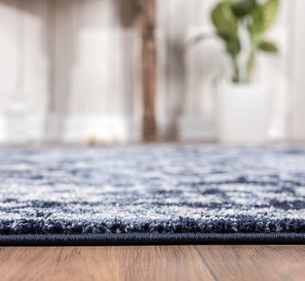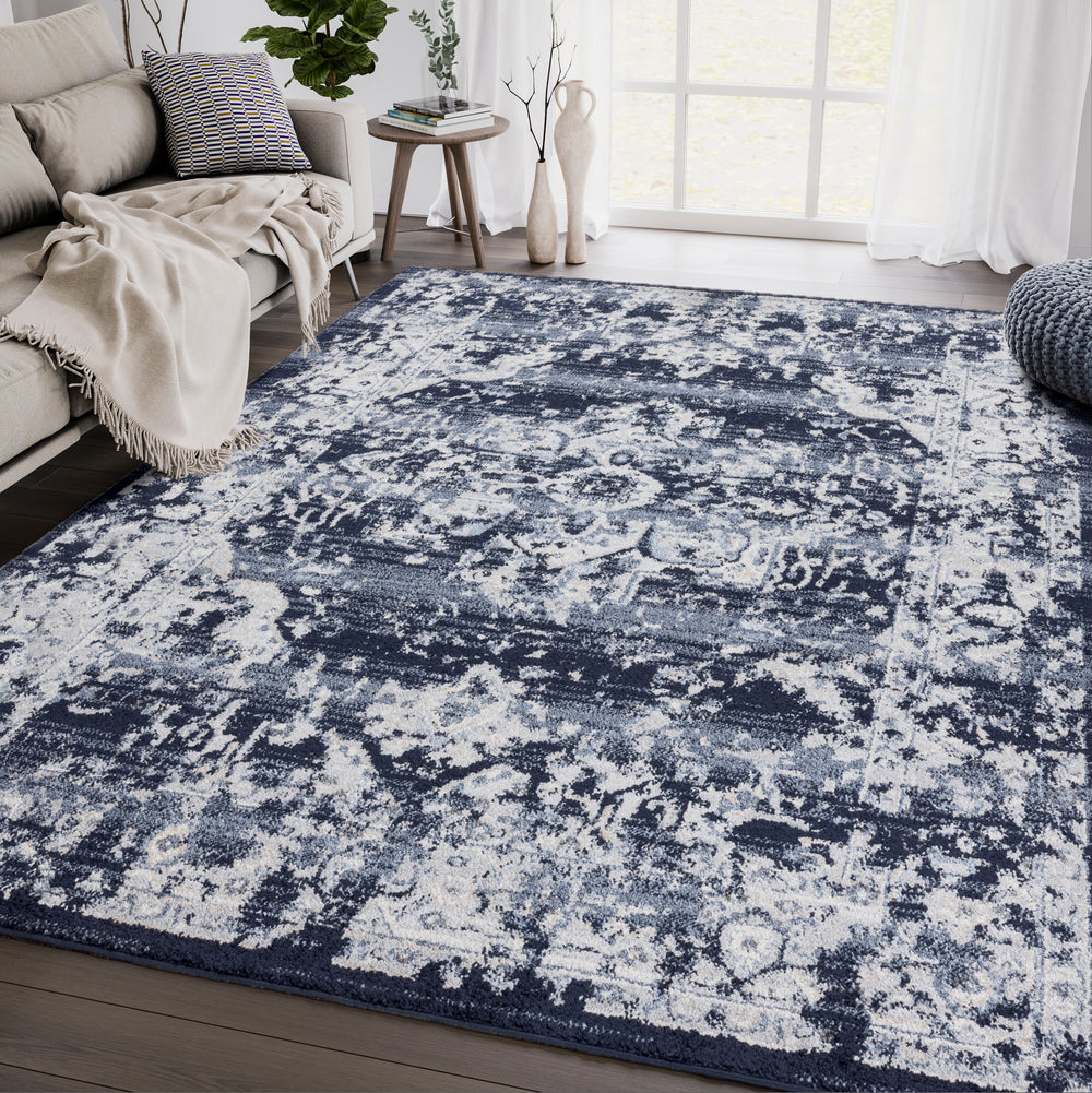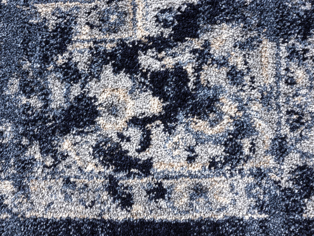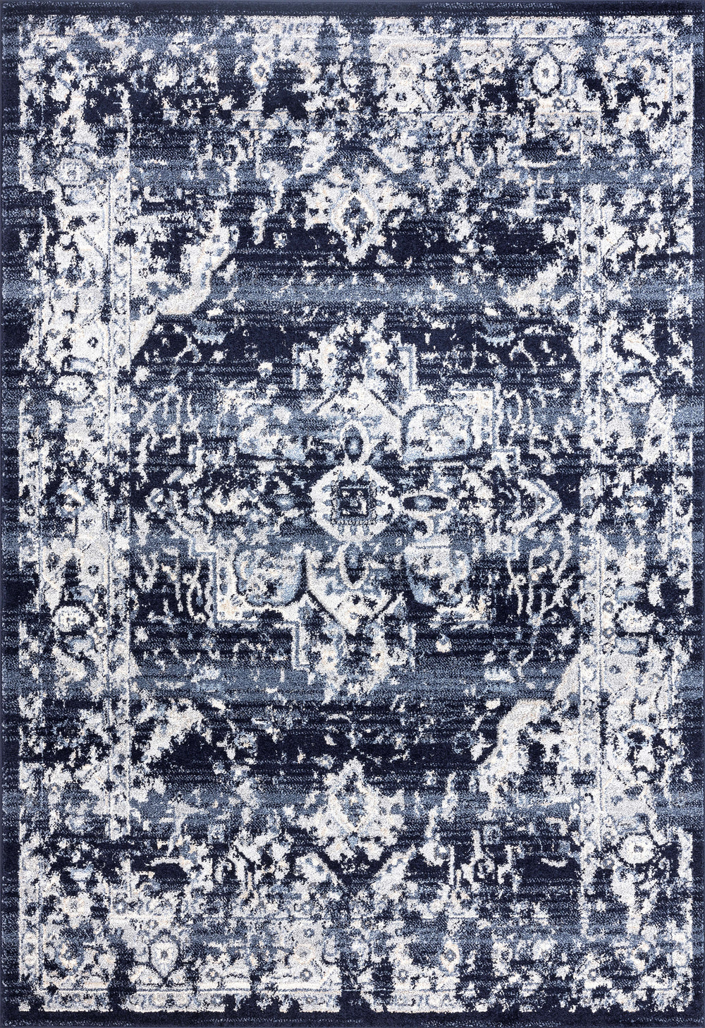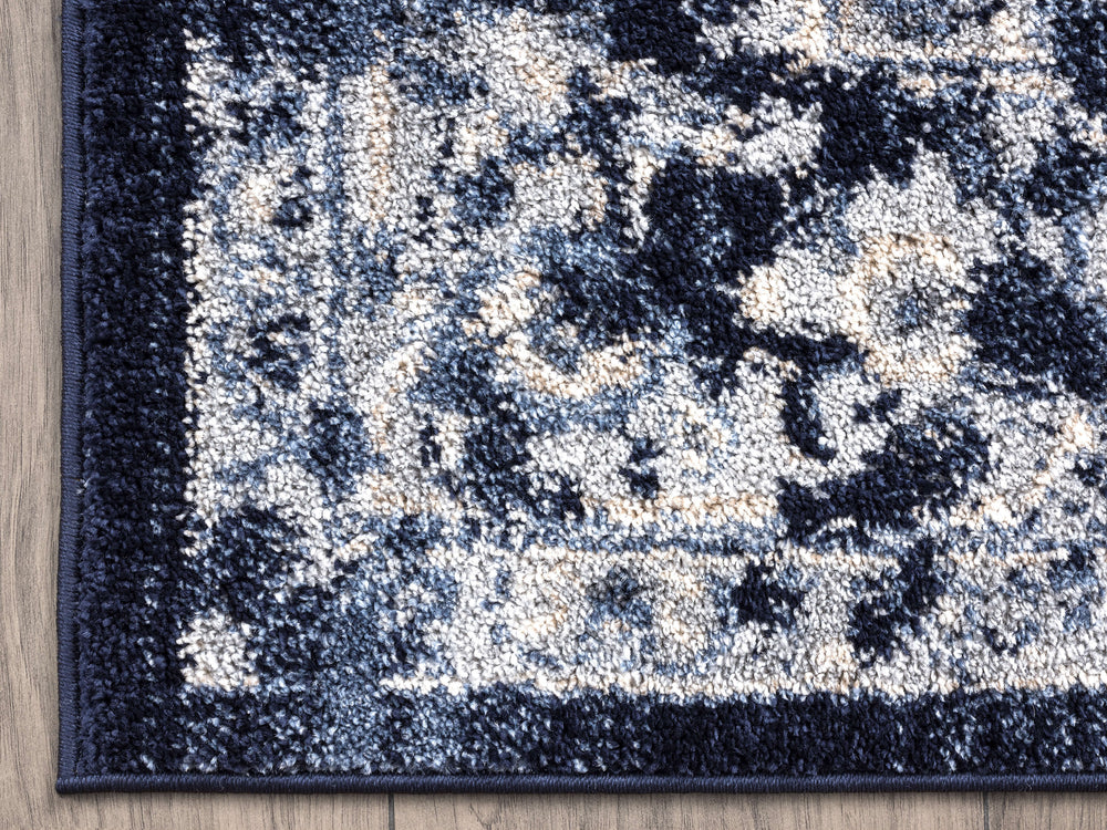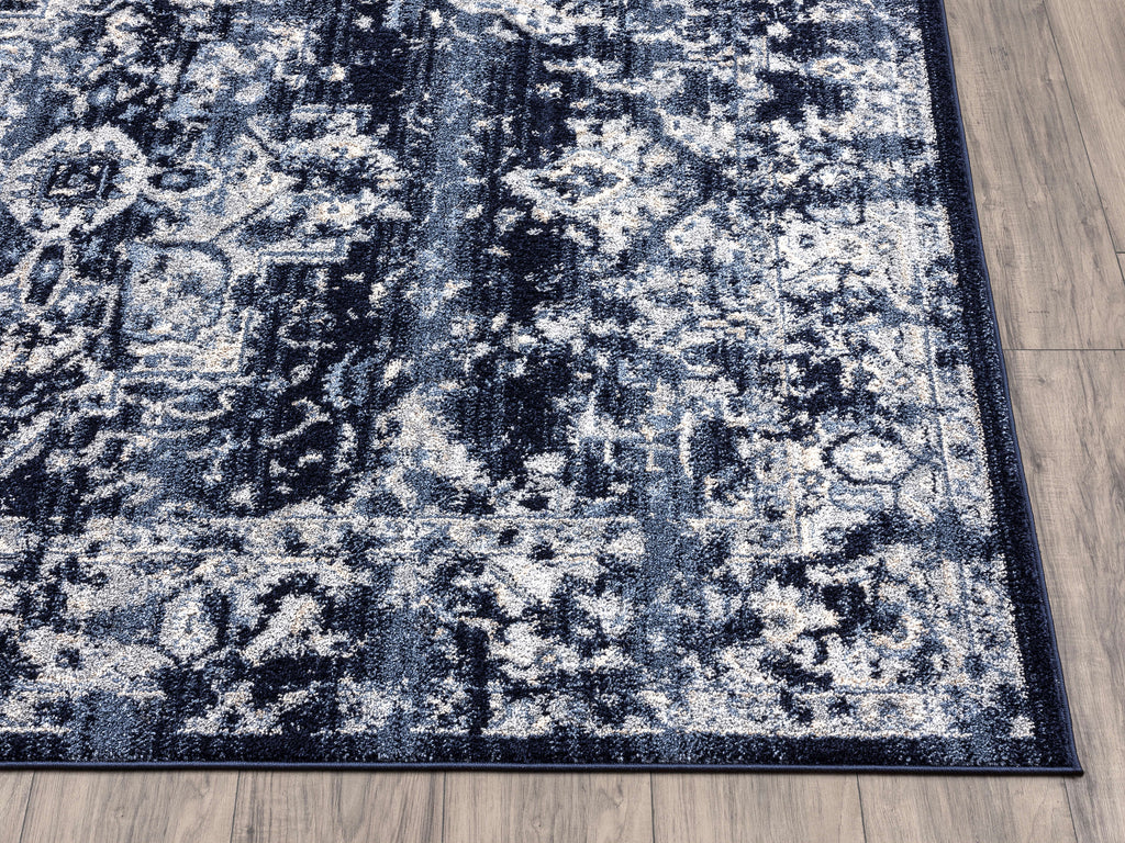 Add a touch of authentic vintage vibes to your eclectic, magazine inspired space, with this distressed beauty from our Babylon Collection. Featuring an elegant navy and ivory color scheme, this rug is super easy to clean and as versatile as ever. Its overall look features a stunning navy colored medallion centered in the middle and bordered by an intricate motif that is appealing to the eye.