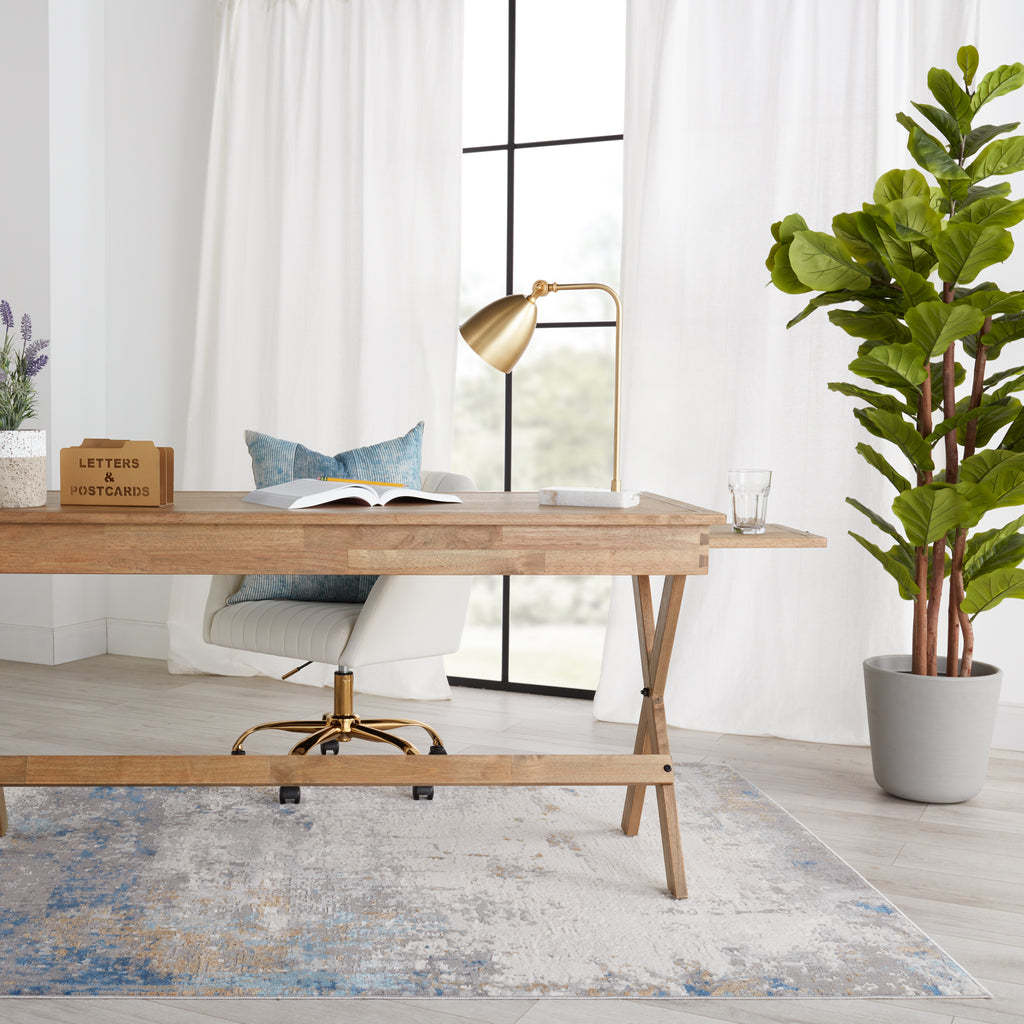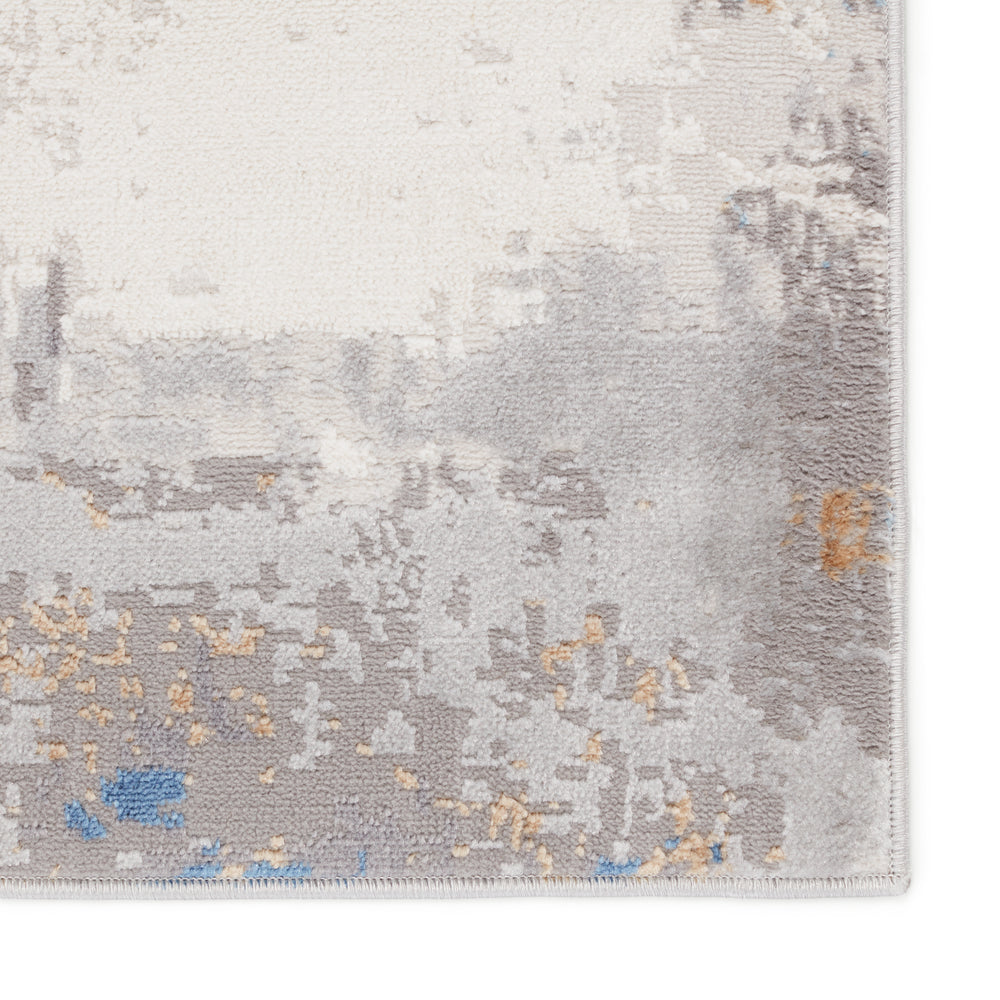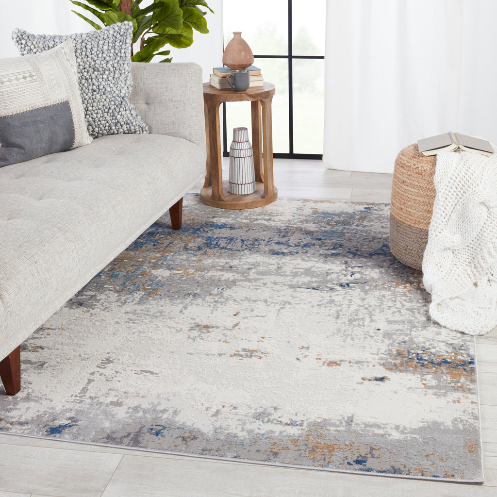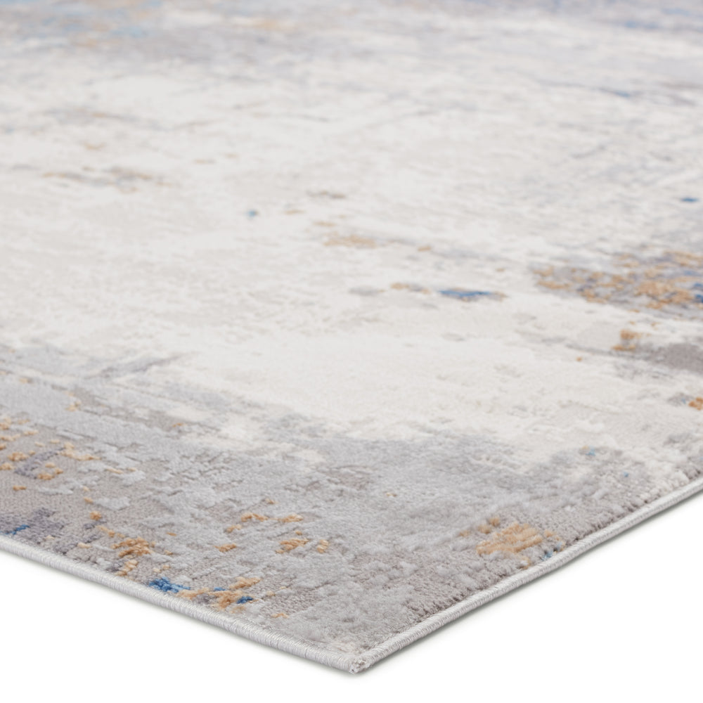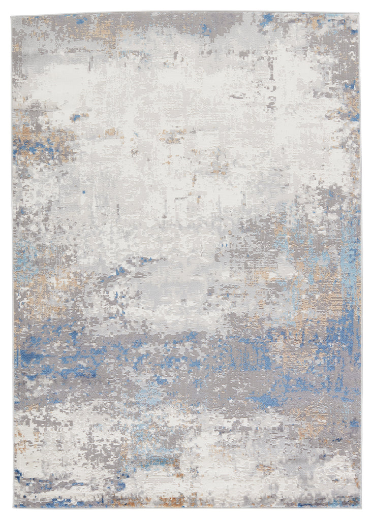 The modern Grotto collection boasts a neutral palette with subtle pops of color combined with formation-like motifs. The textural yet versatile Ridley rug grounds any space with a mottled abstract pattern in tones of gray, black, tan, ivory, and cool pops of blue. Perfect for heavily trafficked spaces, this polyester-polypropylene blend rug is easy to clean and perfect for homes with pets and children.Care Instructions