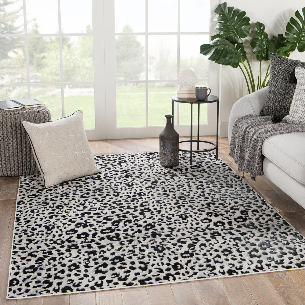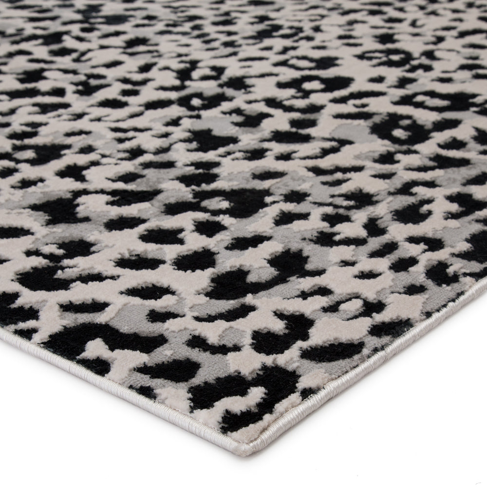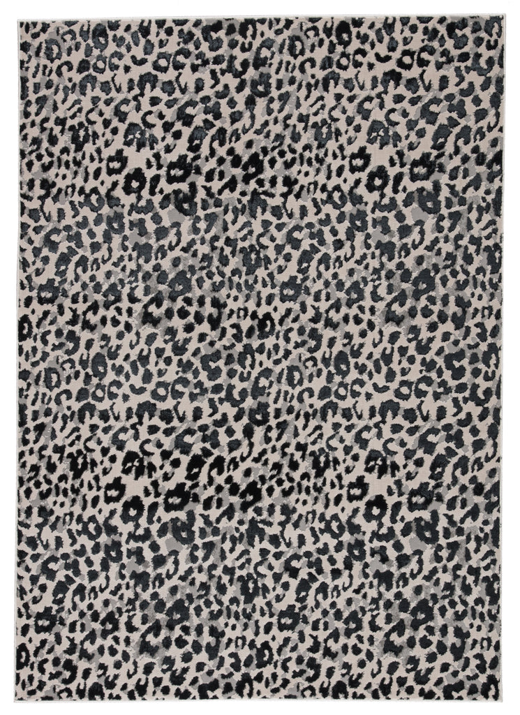 The show-stopping yet surprisingly versatile appeal of the Catalyst collection brings contemporary edge to any home. The silver, gray, and black Fauve rug's wild, spotted animal print is familiar and chic, perfect for adding texture and intrigue to a room. This power-loomed rug features metallic polyester fibers blended with stain-resistant polypropylene for a brilliant sheen from various perspectives.Care Instructions