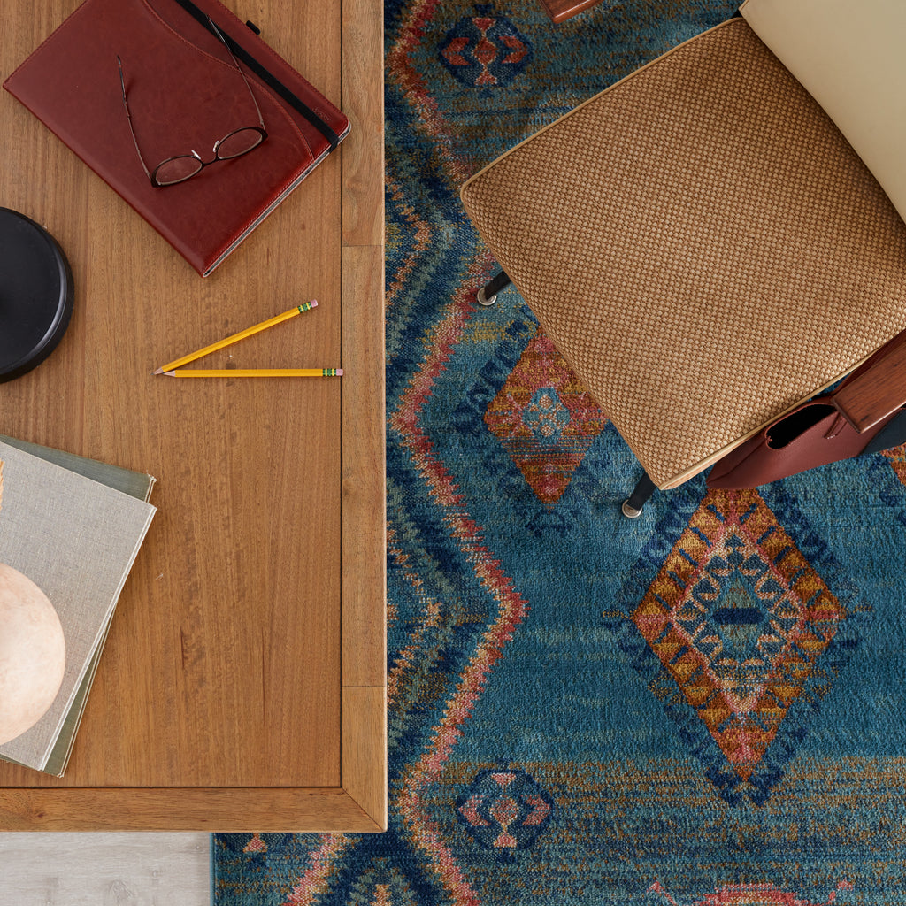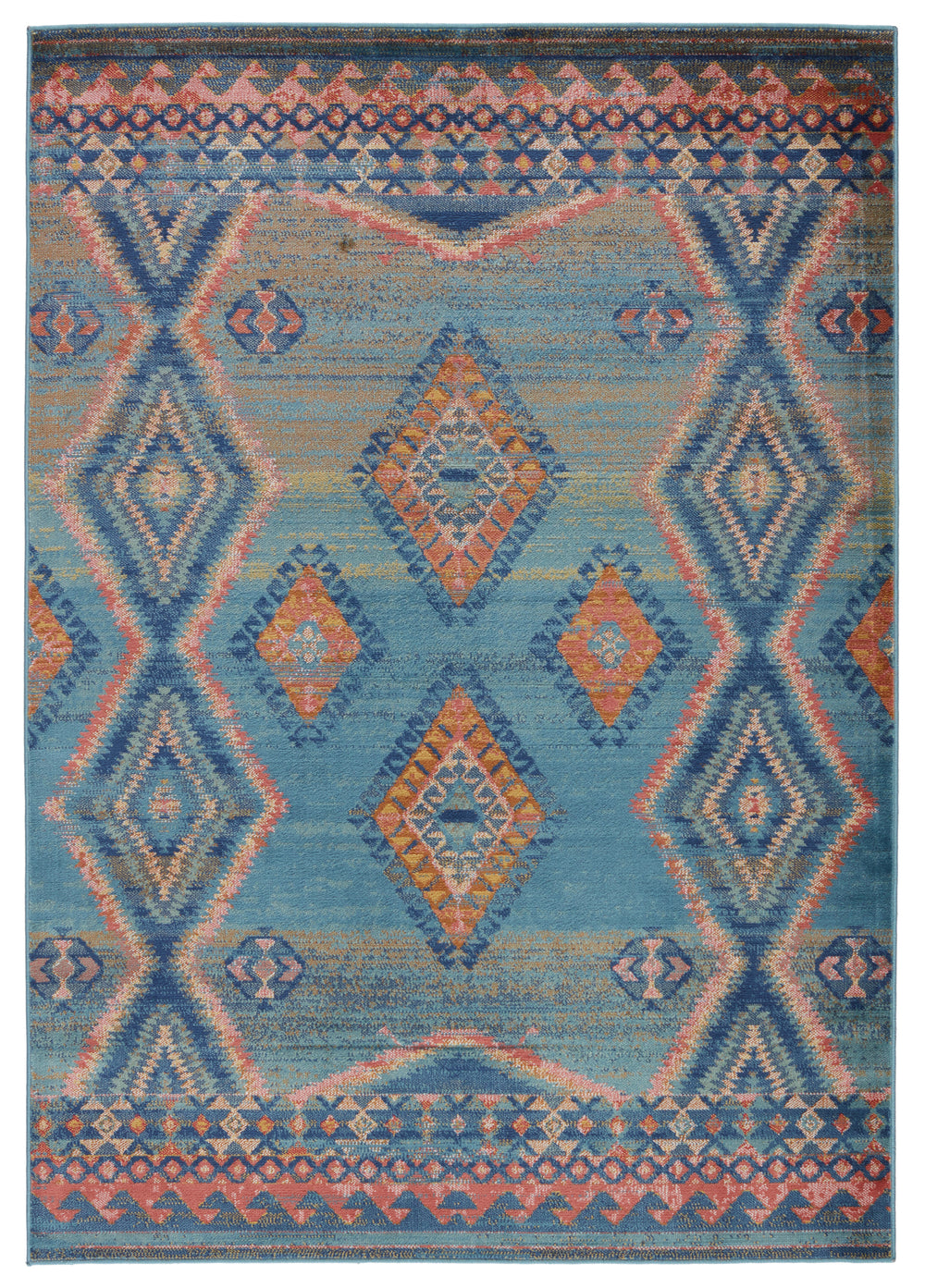 Emulating the bold, saturated colors of vegetable-dyed antique rugs, the innovative Prisma collection combines admired traditional design with a durable polypropylene construction. The Jumelle rug boasts a bold geometric medallion motif in cool blue and green tones with hints of pink and gold. The low pile and easy-to-clean material of this rug proves perfect for high-traffic spaces.Care Instructions
