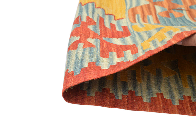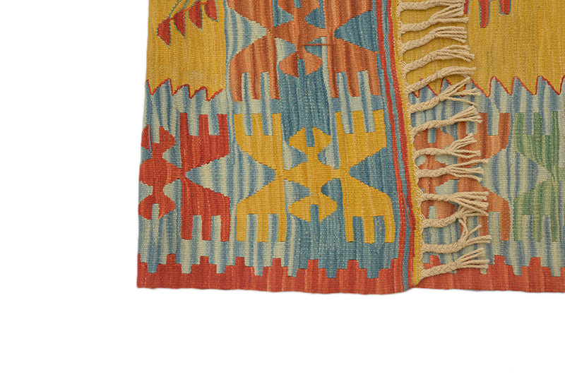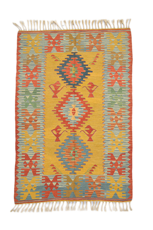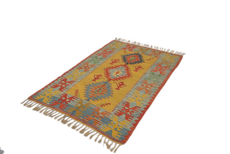 Awe-striking design, brilliant posh shades and flawless entwining of Turkish craftsmanship describe the beauty of this Turkish Kilim! Go ahead decking your lounge area, patio or your living room with this flat-woven accent piece for an incomparable elegance and instant styling to happen. Measuring 3' 8" height and 5' 4" width, you get an accentuated look that hikes up the beauty of your furniture and other decor elements as well. While the matchless medallion motifs in bold red, yellow and blue colors liven up your monochromatic room, the medallion motifs strewn all over adds to its exquisiteness. Do not overlook the distressed fading off happening on the borders, which can never go unnoticed!