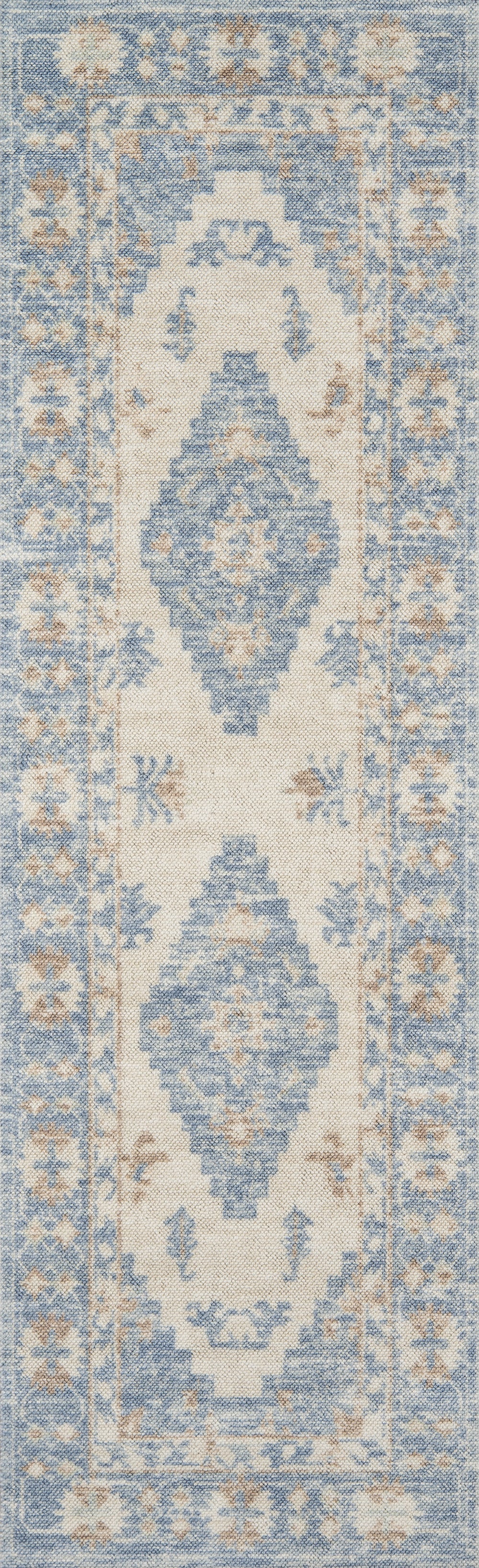The pastel color palette of the Anatolia presents the softer side of tribal style. Subdued shades of pink, baby blue and brown fill the field and ornamental rug borders with classical medallions and vine and dot motifs. Crafted in an innovative combination of natural wool and nylon threads, modern machining mimics ancestral weaving techniques to create a series of chic floor coverings that are superior in beauty and performance.