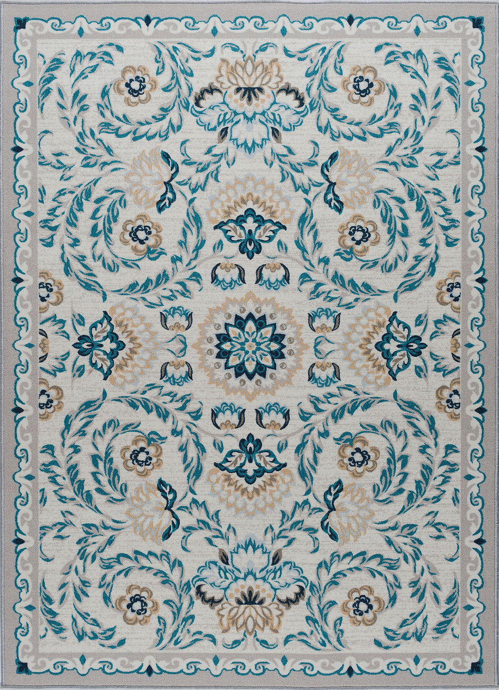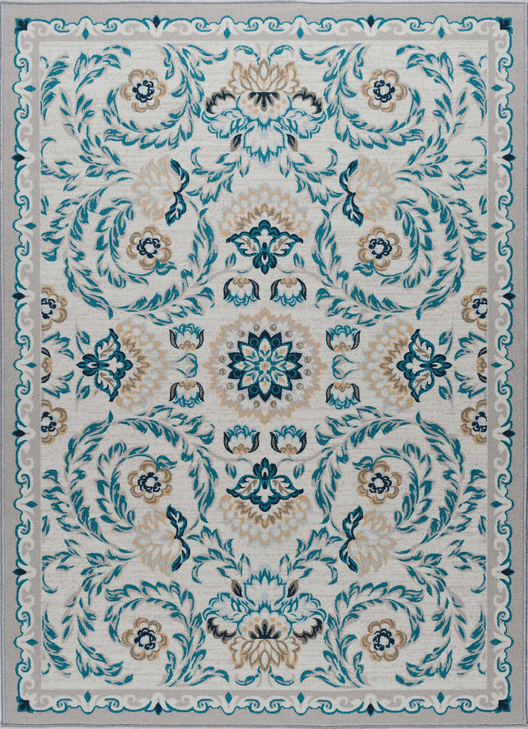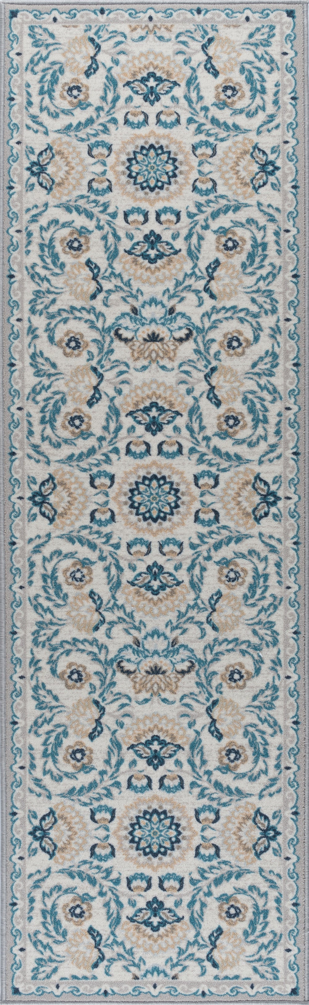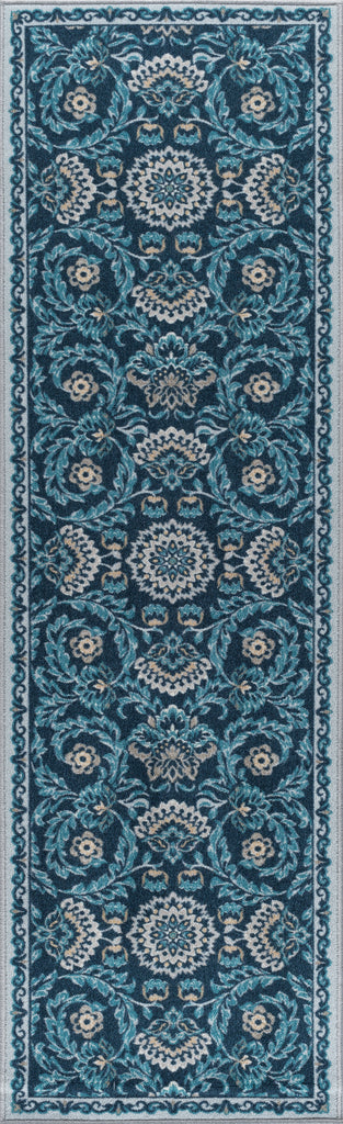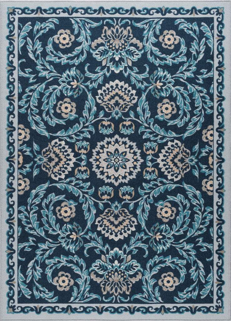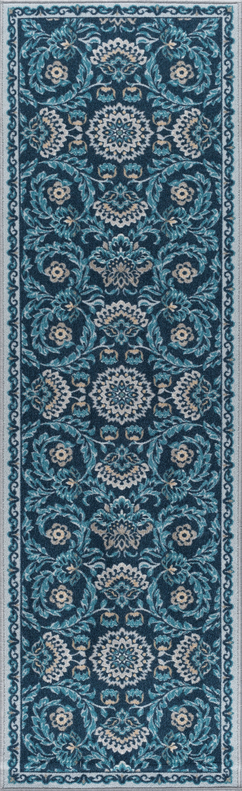 Add a touch of sweetness to your décor with this floral printed transitional area rug. The saturated colors and updated oriental design make an adorable accent. Power loom, machine made of looped nylon yarn to be durable and affordable. In shades of blue, taupe, navy, and cream. Non-skid backing keeps it from sliding on wood, laminate, polished concrete, and tile floors, making this ideal for the kitchen, entryway, bathroom, or family room. Spot clean with mild detergent and water; vacuum on high-pile setting.