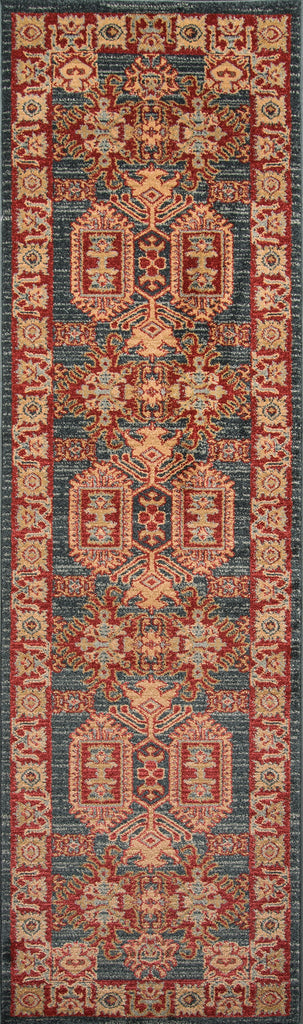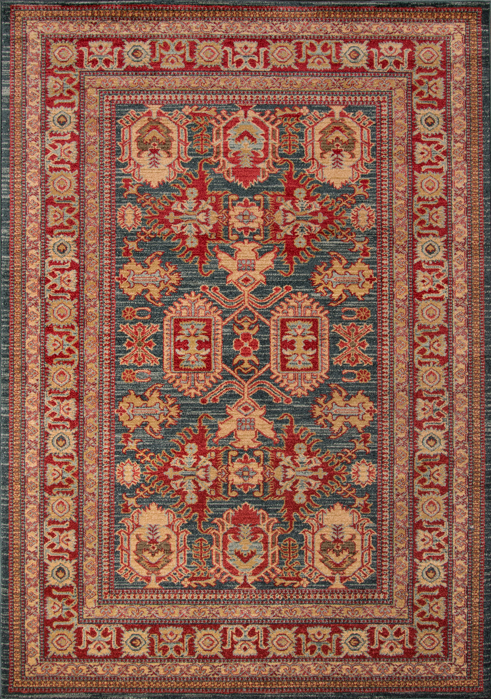 The ornamental elegance of this traditional area rug has deep roots in old world design motifs. Evoking the timeless visual elements inspired by classic Kazak carpets, an eye-catching geometric field of medallions, palmettes and flowers is surrounded by an intricate border in regal shades of crimson red, blue and gold. With references to centuries-old Heriz and Serapi rug patterns, each elaborate rug design is elegantly crafted from soft synthetic fibers, while power-loomed precision ensures this traditional floorcovering will truly stand the test of time.