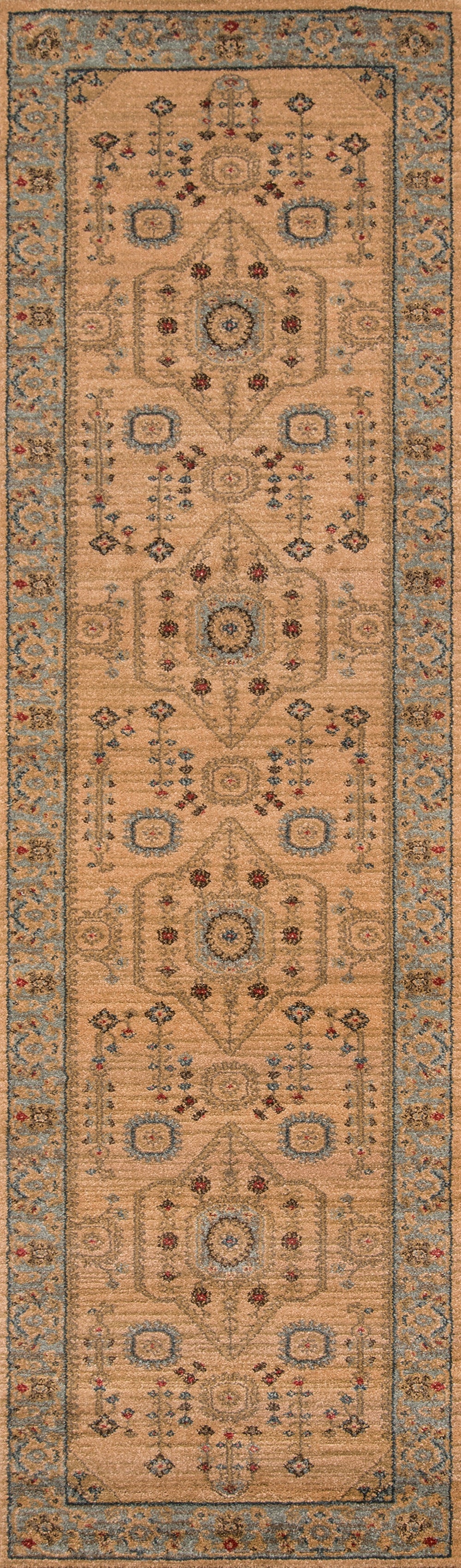 The ornamental elegance of this traditional area rug has deep roots in old world design motifs. Evoking the timeless visual elements inspired by classic Kazak carpets, an eye-catching geometric field of medallions, palmettes and flowers is surrounded by an intricate border in regal shades of crimson red, blue and gold. With references to centuries-old Heriz and Serapi rug patterns, each elaborate rug design is elegantly crafted from soft synthetic fibers, while power-loomed precision ensures this traditional floorcovering will truly stand the test of time.