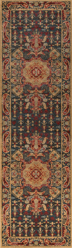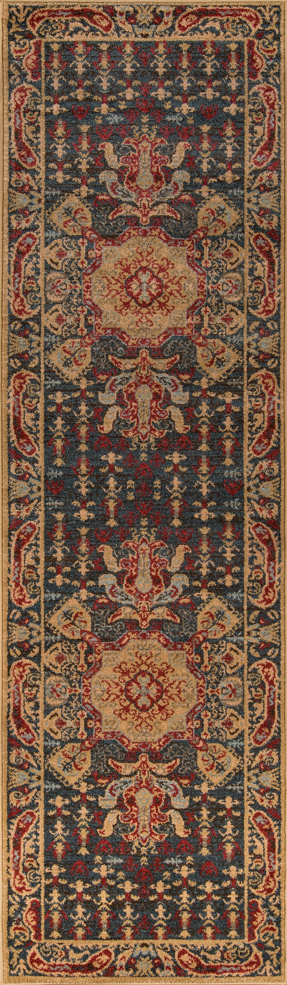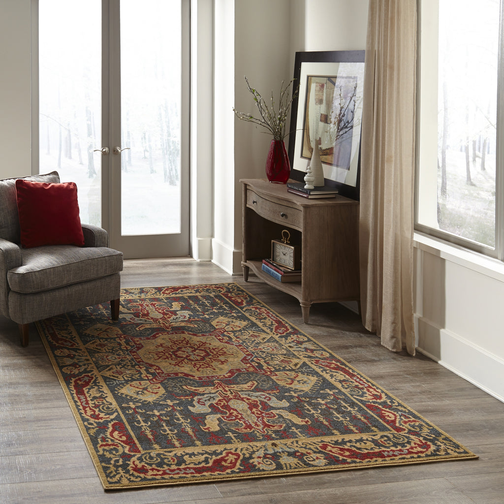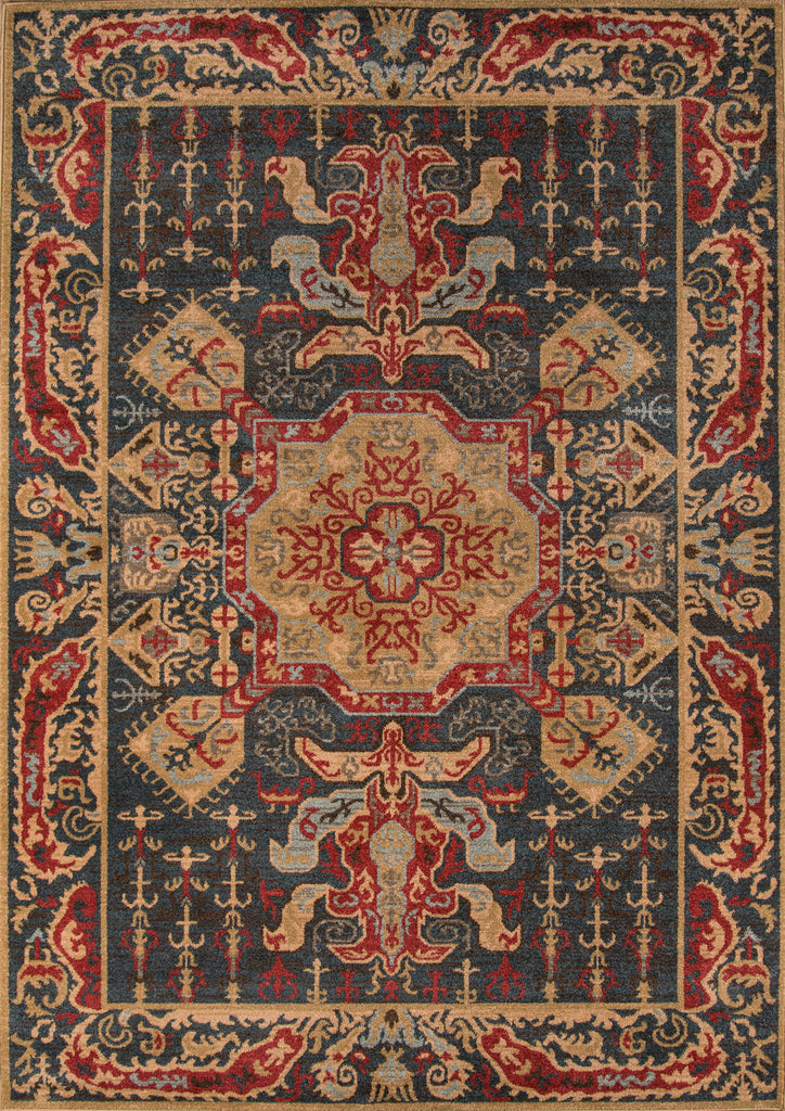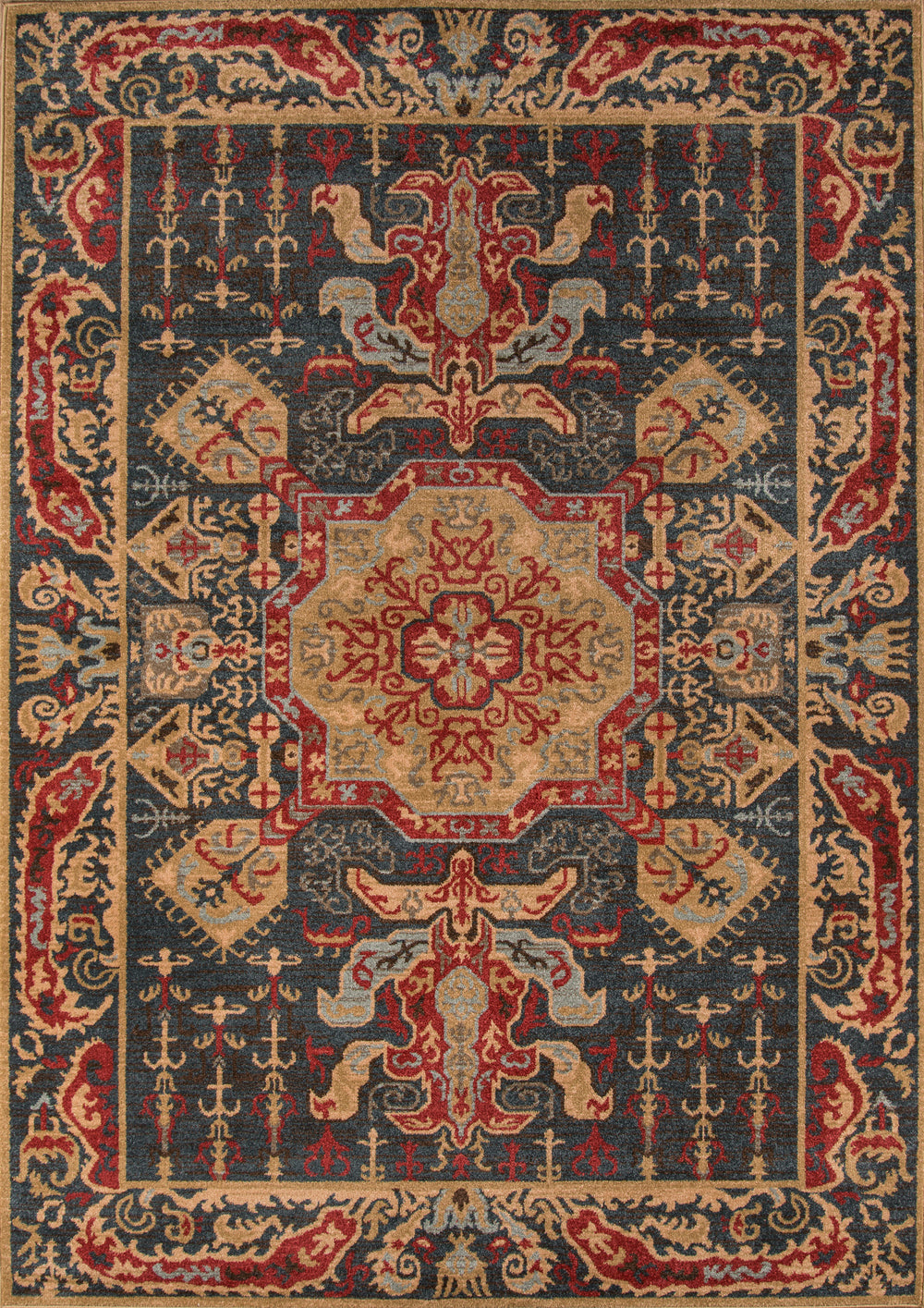 The ornamental elegance of this traditional area rug has deep roots in old world design motifs. Evoking the timeless visual elements inspired by classic Kazak carpets, an eye-catching geometric field of medallions, palmettes and flowers is surrounded by an intricate border in regal shades of crimson red, blue and gold. With references to centuries-old Heriz and Serapi rug patterns, each elaborate rug design is elegantly crafted from soft synthetic fibers, while power-loomed precision ensures this traditional floorcovering will truly stand the test of time.