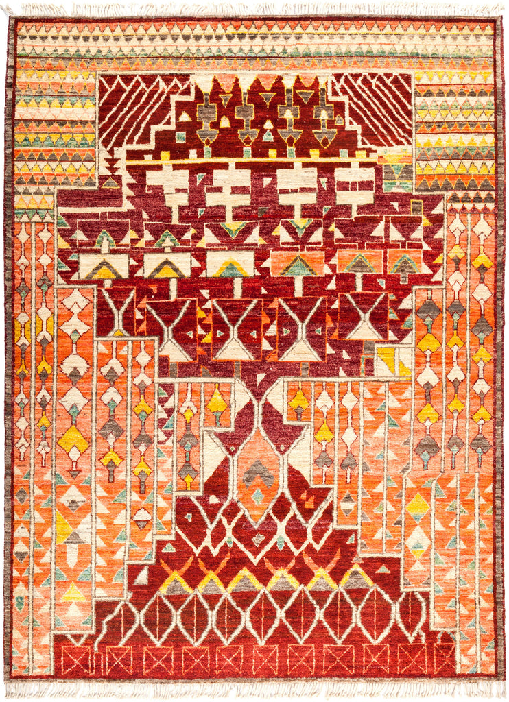 These area rugs resemble traditional Persian style tribal village designs. These rugs are bold, striking and colorful. South Persian tribal pieces, true Ziegler Sultanabads, and almost any non-urban Iranian weaving has been interpreted and creatively adapted. These carpets are directly appealing and therefore work well in any context, overall style or period.