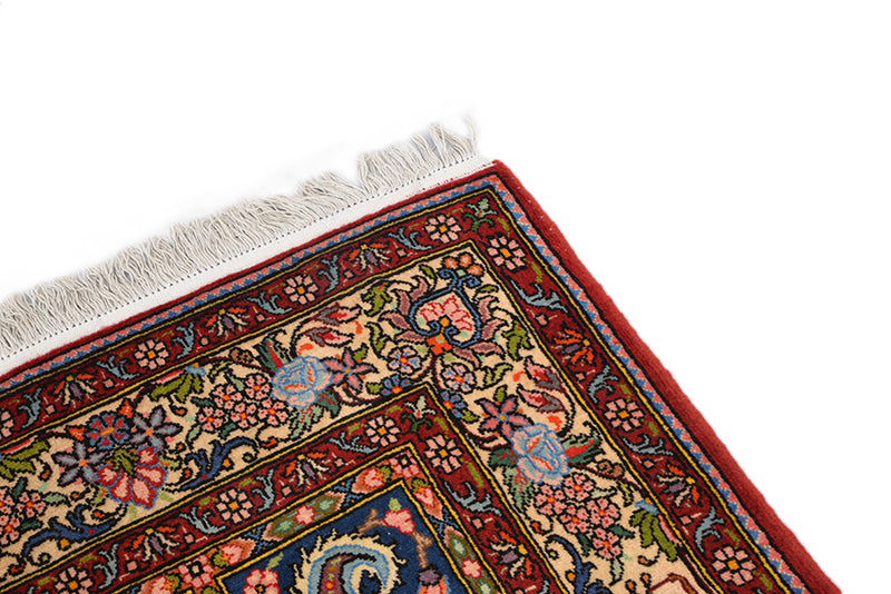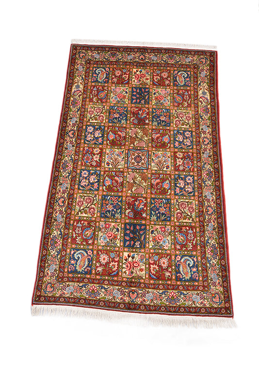 Exceptionally eye-catchy and immersive, this Persian inspired Bakhtiari rug has tribal touch to it, which showcases an elegant design in contrasting colors to create a decor piece that surely works. Symmetrical squares are placed at regular spaces and contain natural motifs like flowers and fruits inside resulting in a breathtaking display of traditional creativity. Bright shades of blue, beige and red are set against each other within small and big borders that guide the eyes inwards towards the rich center. Handspun in original 100 % pure wool, this rug is a symbolism of the history and craftsmanship of Persia. Available in size 5'4"x8'10", this Bakhtiari rug is perfect for high traffic areas and lasts for years to come.