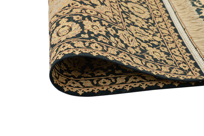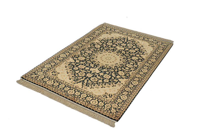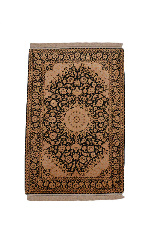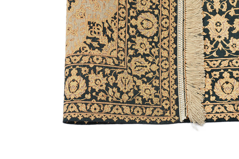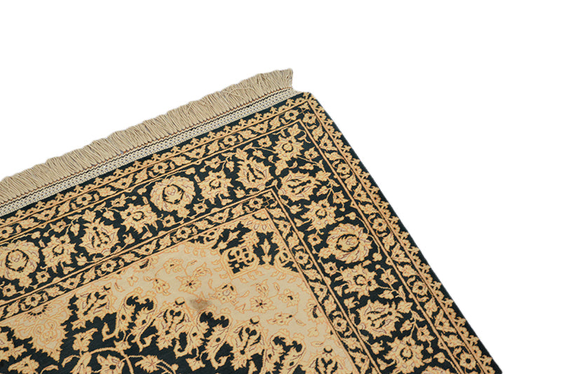 A timeless classic to go well with both modern and traditional setting, this Qum rug is sure to leave everyone spellbound at its beauty. The master weavers’ intricate weaving and minute hairline details including the fine lines, drapes, waves, floral motifs and wrinkles of the typical Qum Rug are seen in this masterpiece as well! Inspired by the Persian masters, this Qum Silk Rug comes filled with complexity, which you don’t get to see in many other counterparts! This rug in beige and black combination is worth talking about with its woolen make. Any art freak that is aware of the basic knotting technique would get bedazzled at its knot density and closely packed intricacy. Knotted by hand by professional carpet weavers, this incredible masterpiece replenishes your whole interior with its individualistic defining style