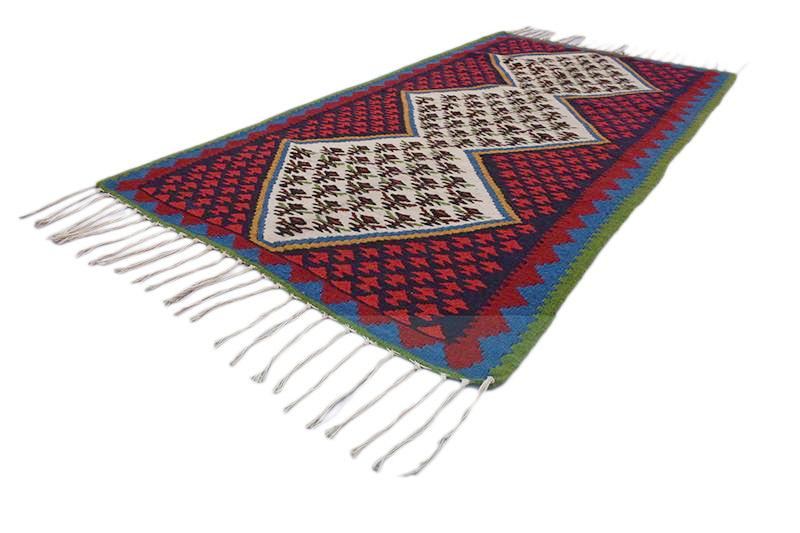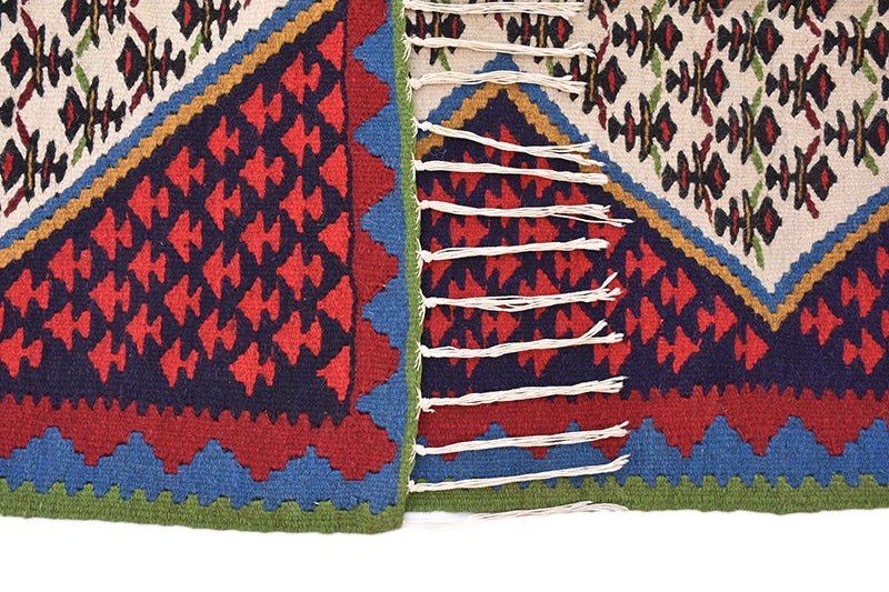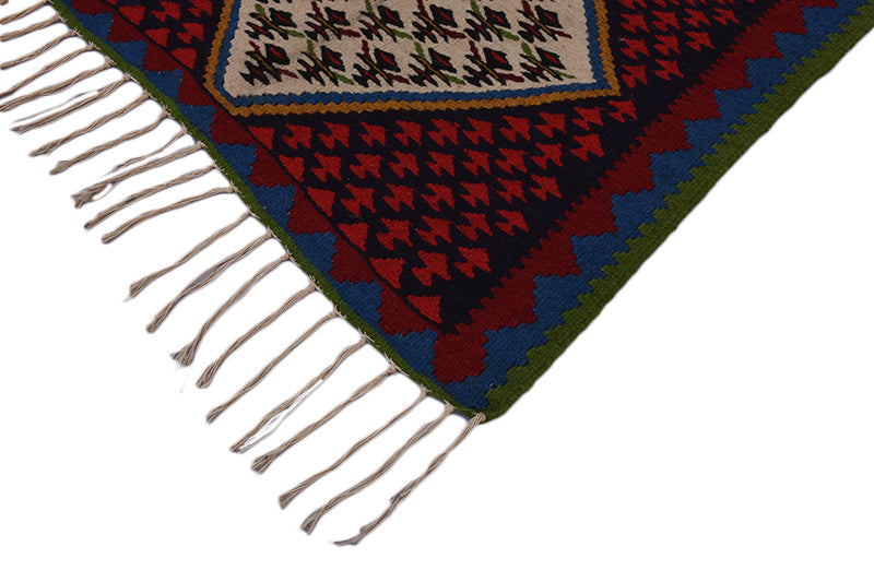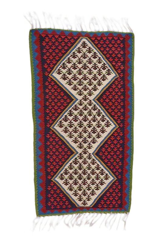 Exhibiting a meticulously drawn colorful pattern, with noticeable medallion in the middle, the Senneh tribal rug are considered extraordinarily beautiful and most desired floor piece to enrich a living room. Antique Senneh rugs and carpets, are produced in Northwest Iran and are highly appreciated and prized for their fine, delicate design and weaving technique. Made of high quality wool and cotton, measures 2’11x5’8” with prominent red, blue and biege colors among repetitive motifs in a symmetrical pattern along with medallion in the middle makes it unique in any settings. Genuinely, a most preferred rug for its all-over design and dominating colorful patterns, which is all you need to add the splendor to your living room in addition to inspired designs in the medallion to enhance the perfection of your home.