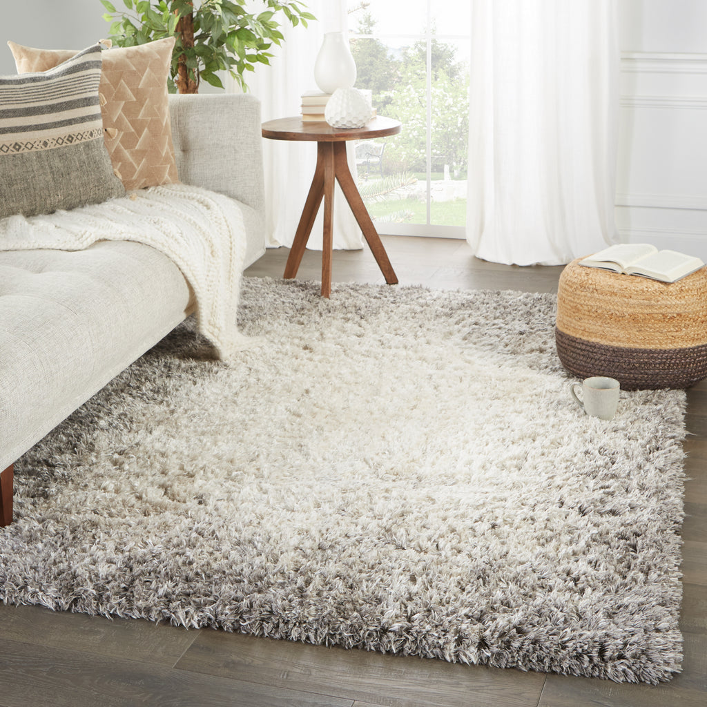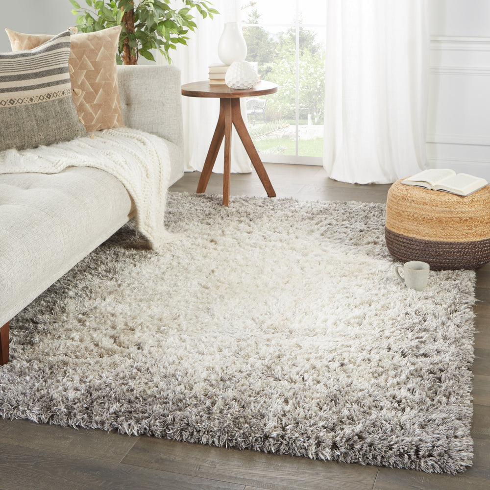 Plush and inviting, the shaggy Izara collection melds modern appeal and a chic neutrality. The Fadey area rug is a wonderful accent of texture with a vignette-style, ombre design that fades from dark gray to cream with hints of white. Power loomed of durable and virtually shed-free polyester, this lustrous rug boasts an incredibly soft and indulgent feel.Care Instructions