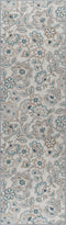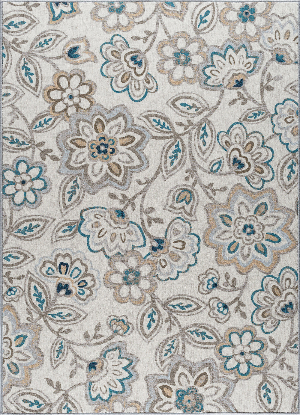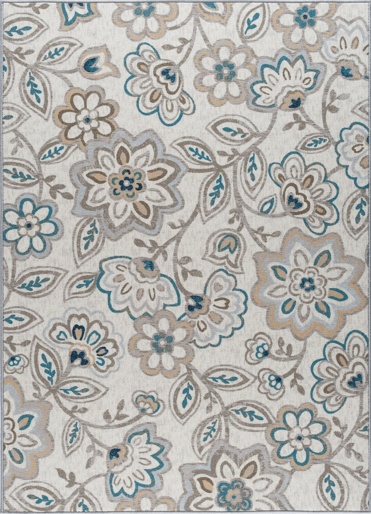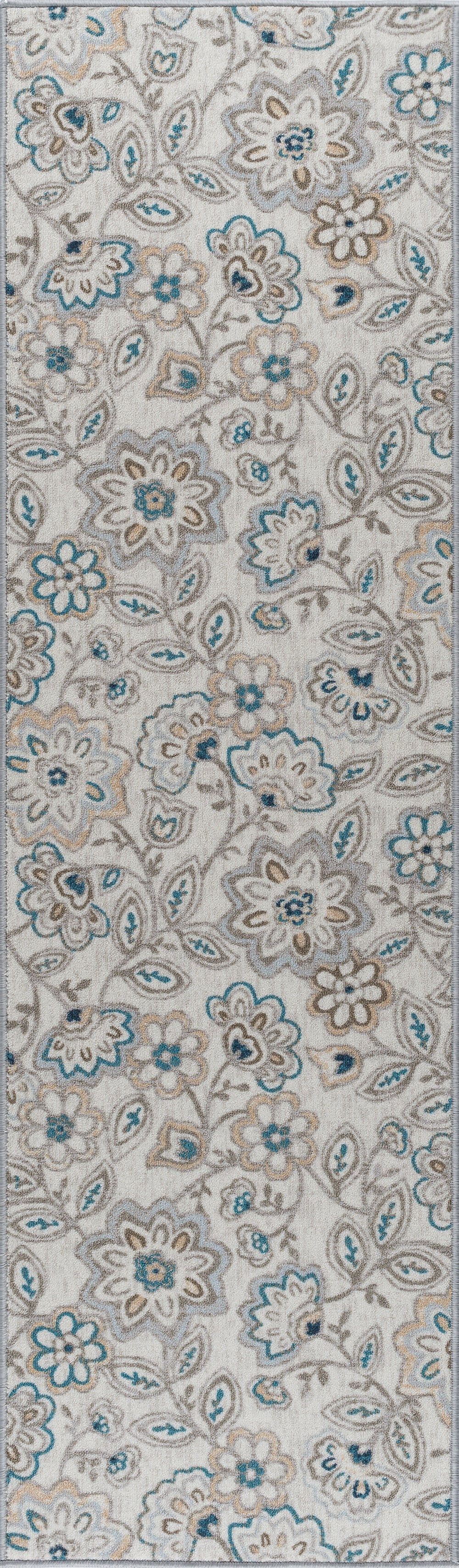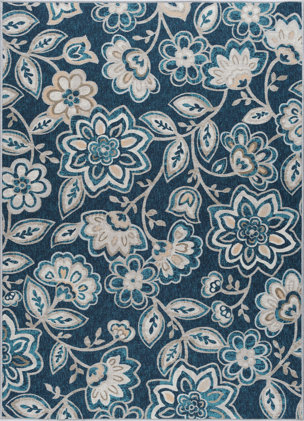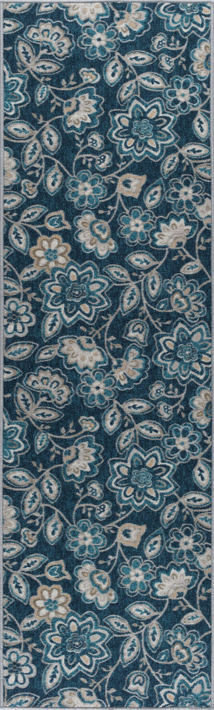 Enliven your decor with this bold floral printed transitional area rug. Perky flowers and vines create a stunning design. Power loom, machine made of looped nylon yarn to be durable and affordable. In shades of blue, taupe, navy, and cream. Non-skid backing keeps it from sliding on wood, laminate, polished concrete, and tile floors, making this ideal for the kitchen, entryway, bathroom, or family room. Spot clean with mild detergent and water; vacuum on high-pile setting.