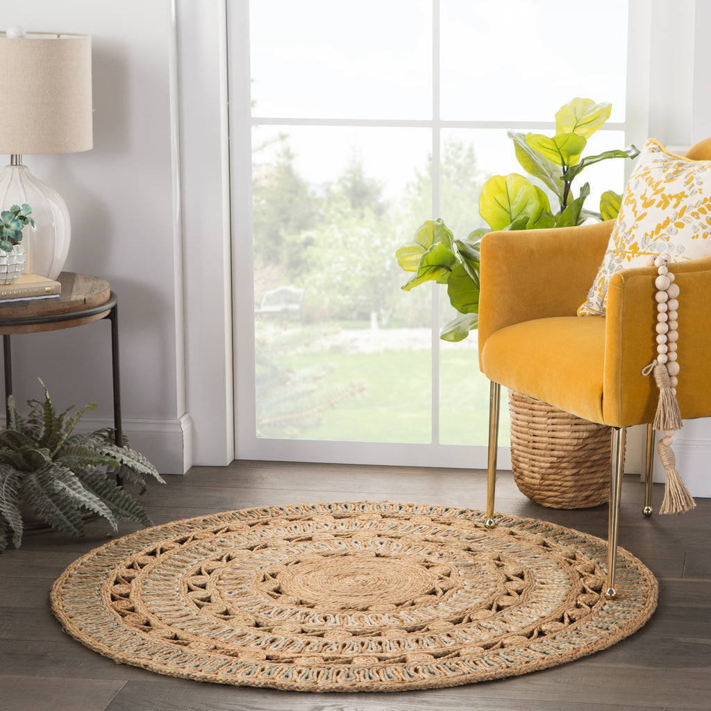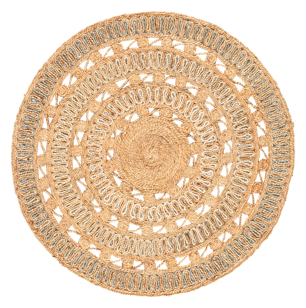 The Cercles collection brings fresh, bohemian charm to spaces in need of a round shape. The Peony rug features intricate bands of woven patterns that spiral into a circular design. Rich with texture and style, this whimsical accent is made of natural jute in a warm wheat and cool gray duo-tone colorway.