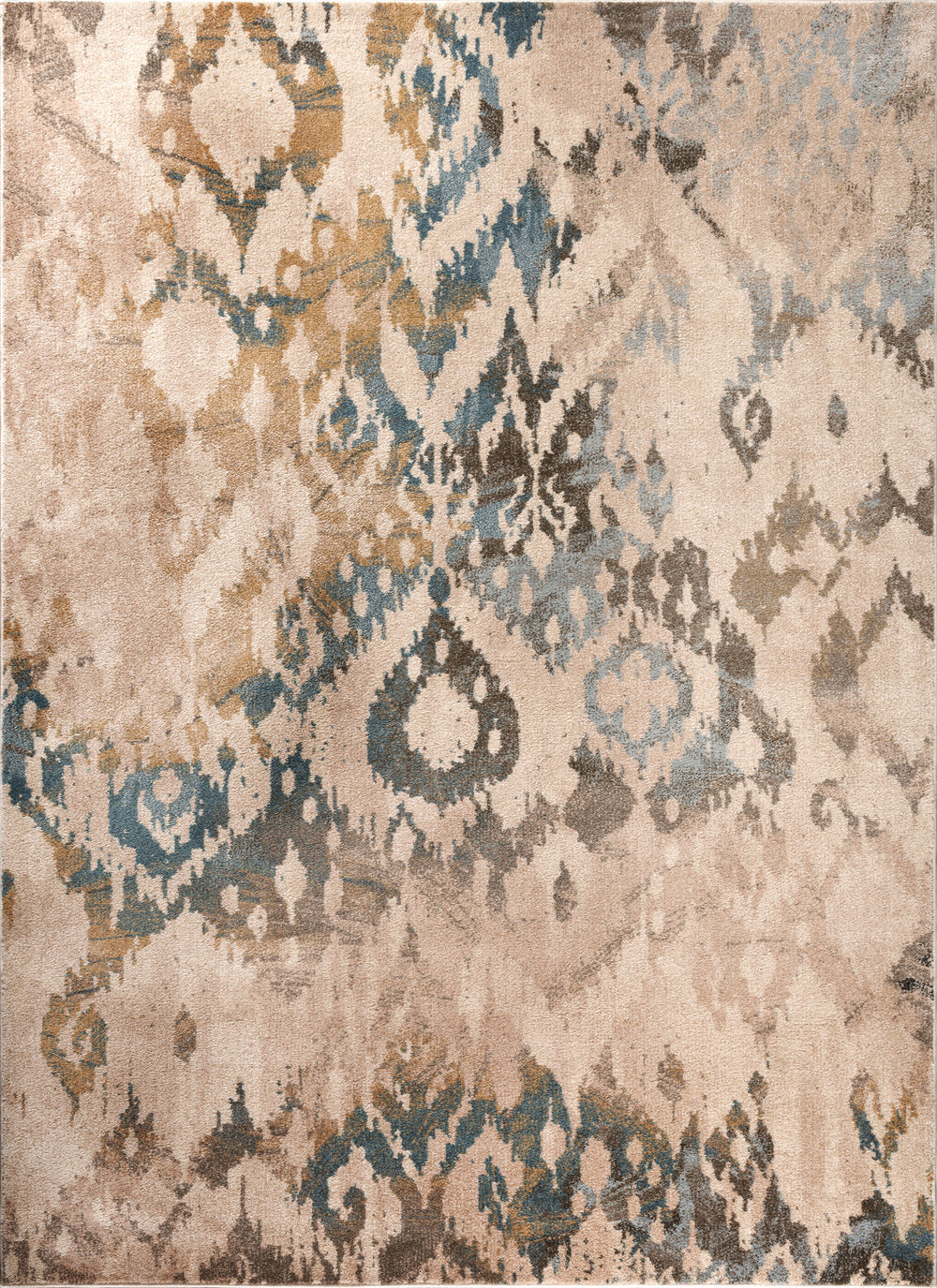 A fresh take on Ikat, this transitional area rug incorporates contemporary colors in a vintage, distressed finish for a subtle statement. Just as comfortable in contemporary or Industrial décor as with traditional, Farmhouse styles. A very versatile and inspirational choice for updating to a new look. Cream, navy, charcoal, light blue, gray, and beige. Machine-made of naturally stain-resistant, ultra-soft polyester yarn, with jute backing for a substantial feel. Vacuum on high-pile setting to remove debris; spot clean with mild detergent and water when necessary. Do not bleach.