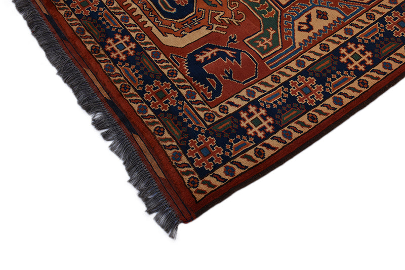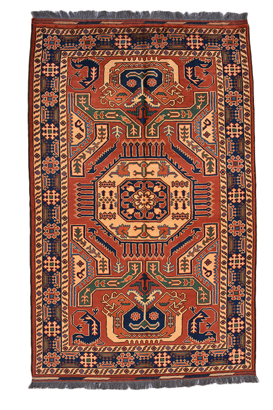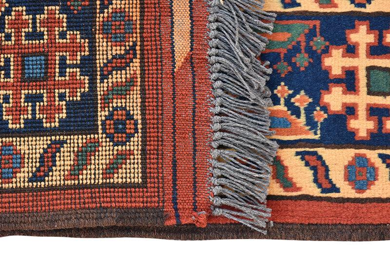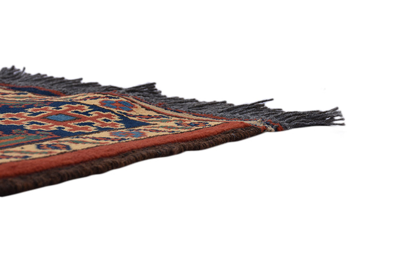 Mixed with colours of yellow, red and blue this Turkman rug fits perfectly into any vintage style. Its intricate and precisely made patterns adds more spice to the rug. Measuring 4''2 x 6' 6" and made of 100% wool, it ensures colour consistency and maximum durability and quality that matures with age. Mastered using Karghai design it brings up ancient elegance. Intertwined with differently coloured warp and weft yarns gives this rug an ideal look. Blended with ancient geometric patterns and ideas, this rug compliments modern and ancient room decor, giving the floor space an aura of historical outlook!