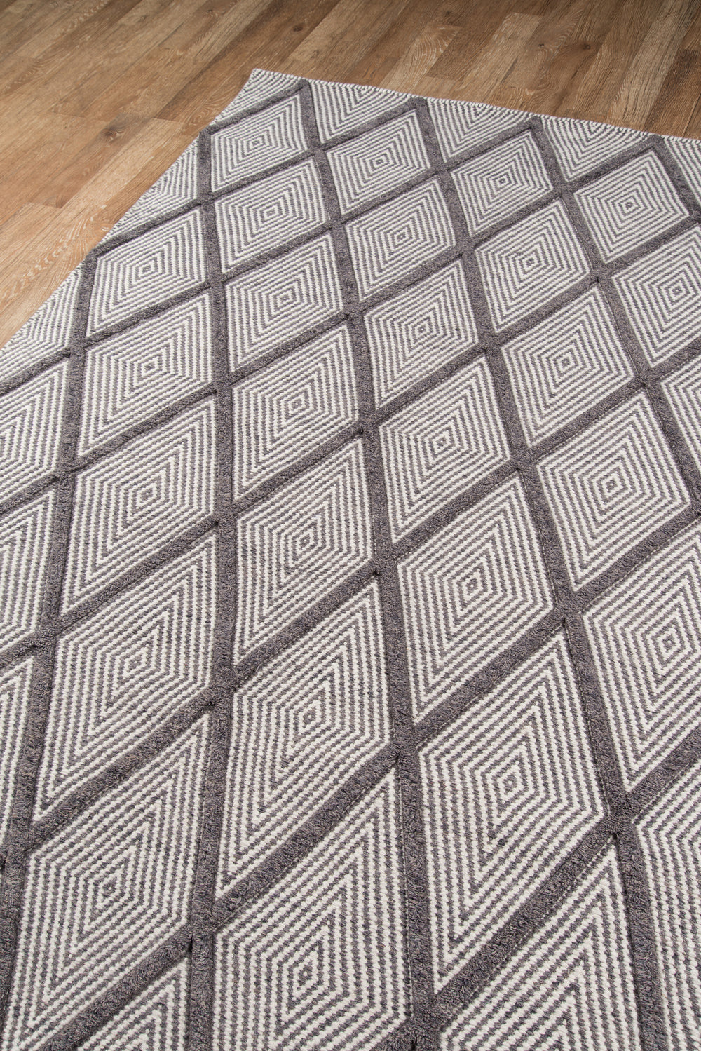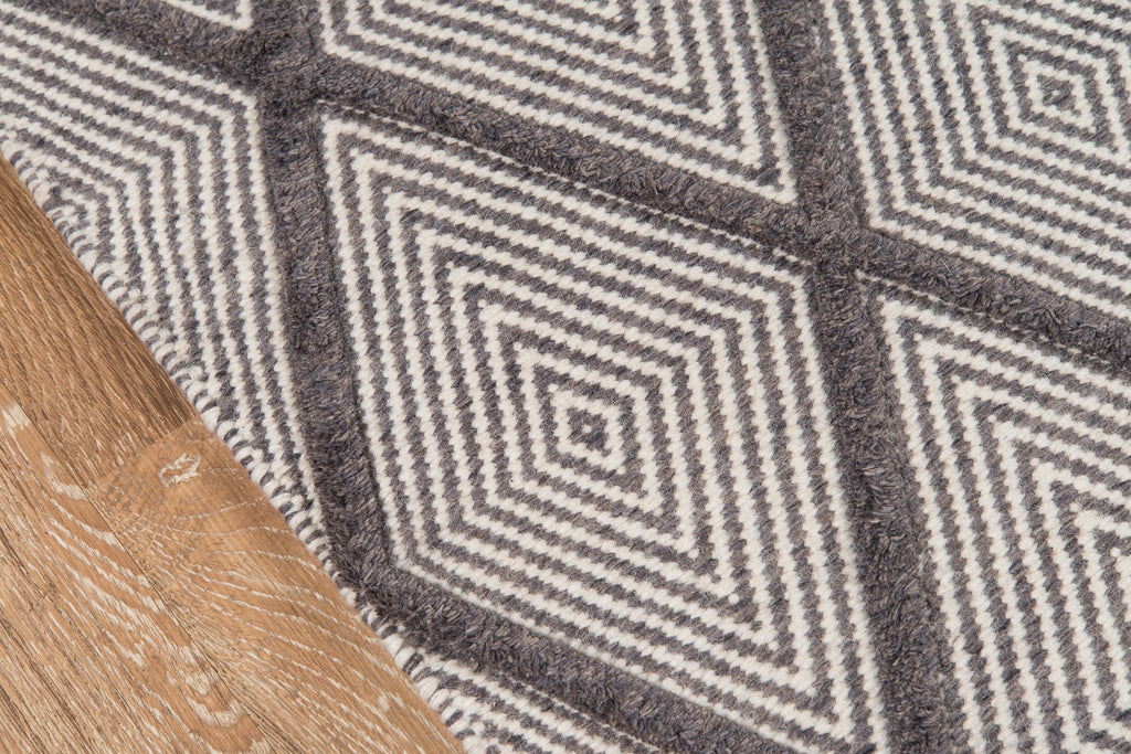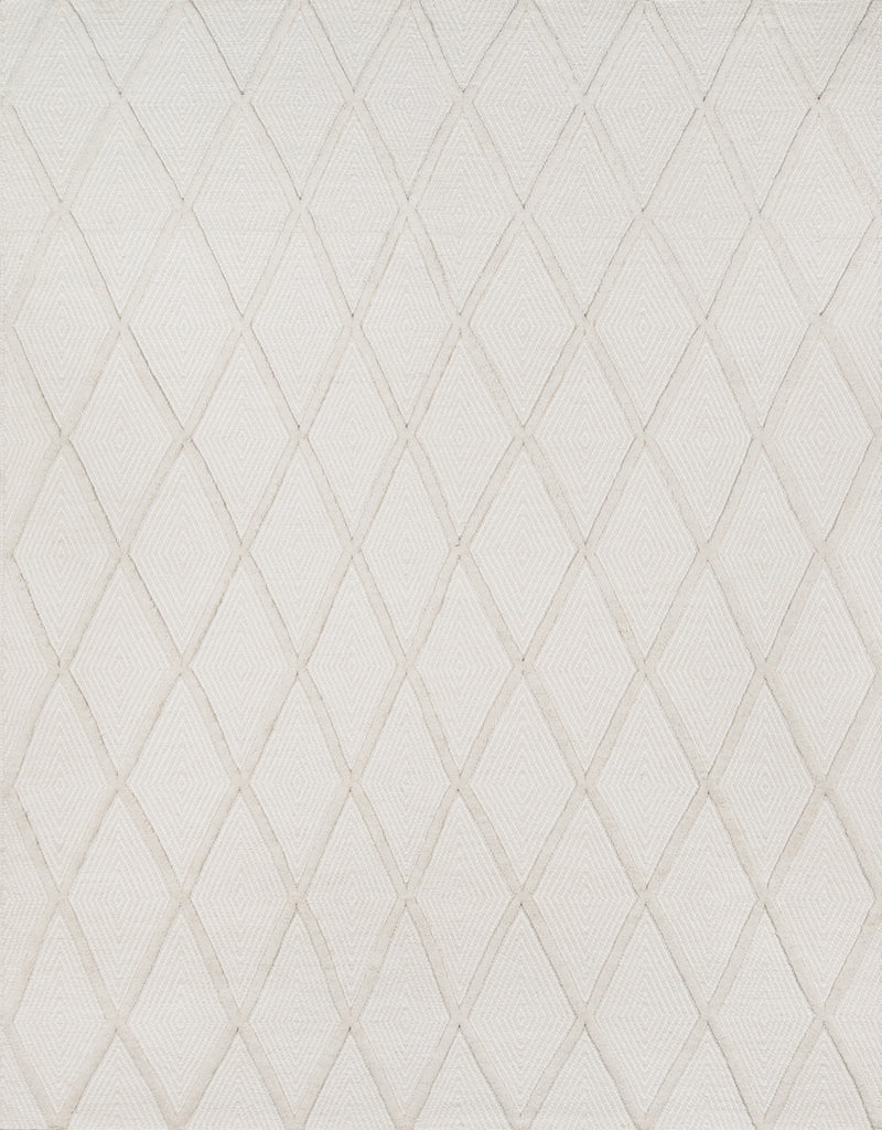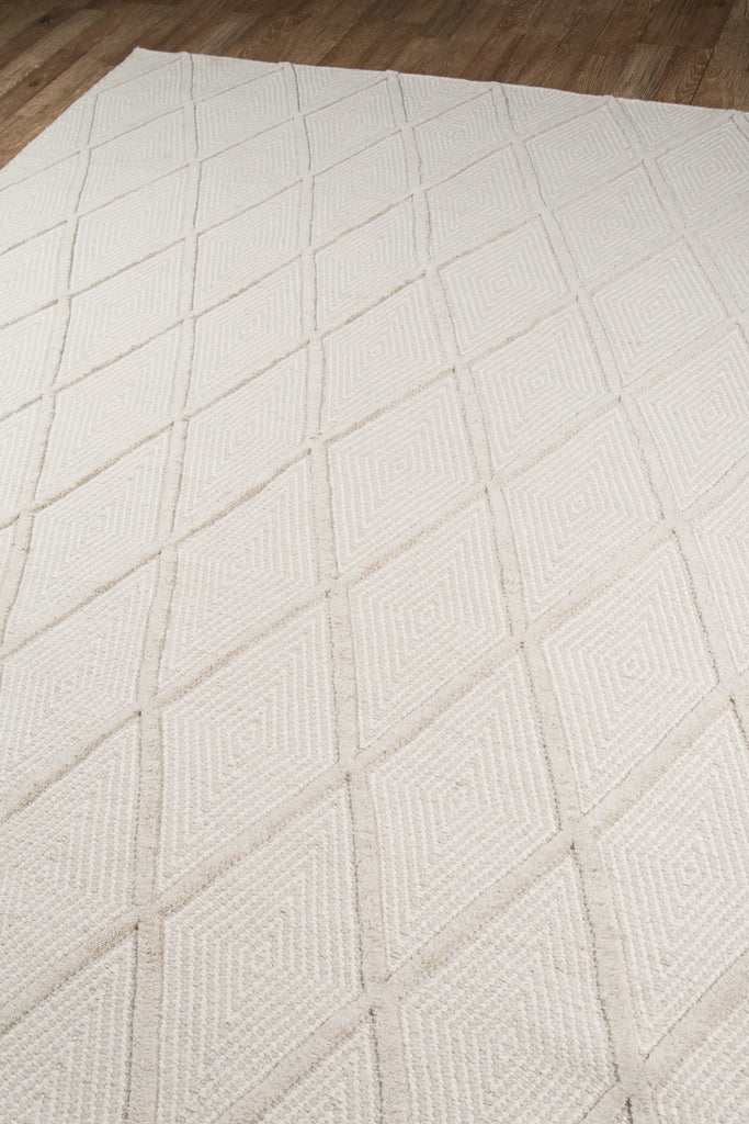 Instill interior floors with a sense of comfortable calm in this decorative area rug that conveys a hip hygge aesthetic. Hand woven from natural wool fibers, optical, diamond and swiss dot patterns fill the geometric field of each carpet in subdued shades of sky blue, baby pink and beige. A pastel color palette and plush fibers make each accent rug the perfect floorcovering for rooms seeking a soft sensibility.