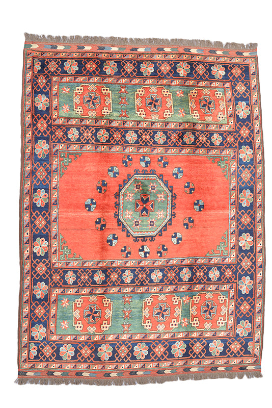 It could be your living room, bed room, patio or your lounge, this Turkmen inspired Kargahi rug fits into everything perfectly well! It comes hand in hand with beauty and elegance. Dressed in red, blue and beige colors this gets an eye grabbling attention, which is only unique to Kargahi rugs. This sort of rug not only fills up floor spaces but also highlights and doubles the beauty of the room décor. Designed and woven in Afghan style it portrays historic elegance and precise workmanship. Made of 100% wool it ensures maximum resistance to foot traffic, high quality and long lasting durability. With 6' 2'' x 8' 0' as its measurement, this rug will become your right stylist to enhance the look of your décor.