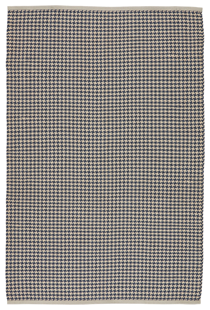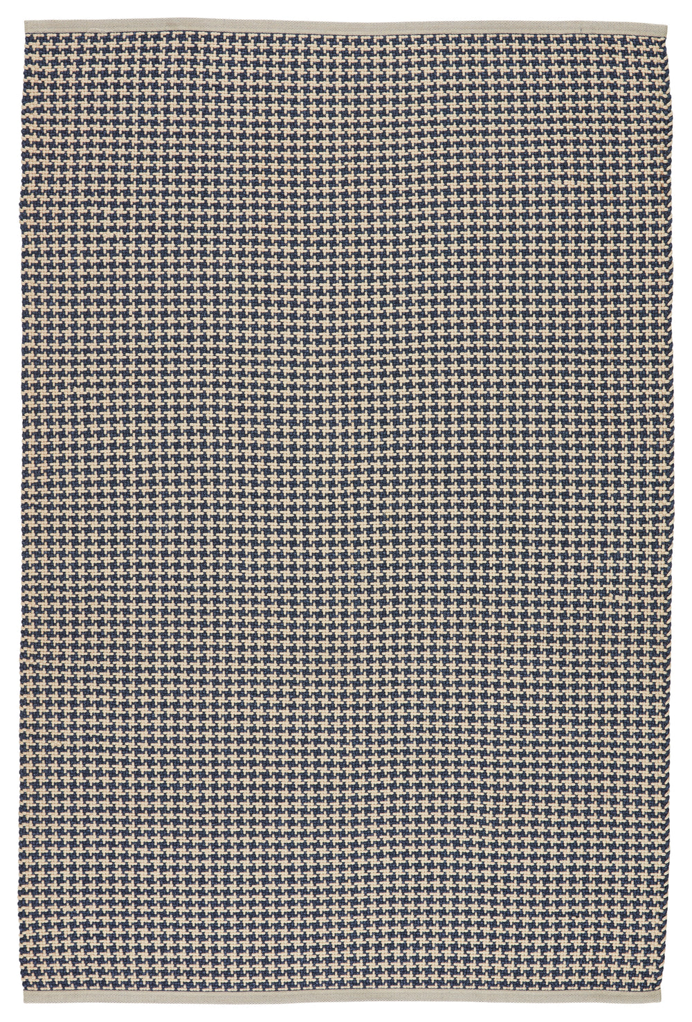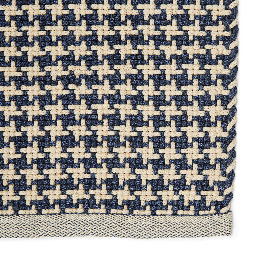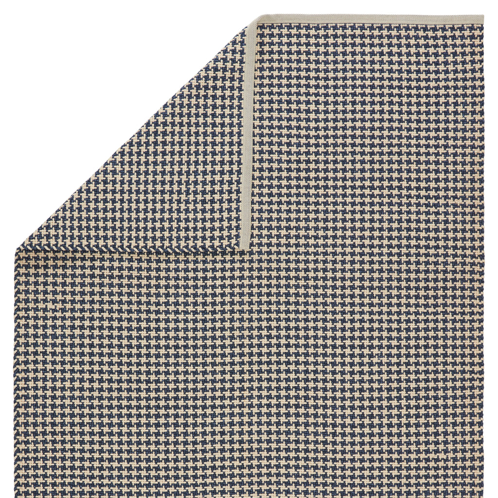 The Finlay collection offers durability and contemporary pattern play to indoor and outdoor spaces alike. The Houndz rug is crafted of weather-resistant, corded polypropylene for a unique and cushioned feel underfoot. This cream and deep blue rug boasts an all-over houndstooth motif for a versatile yet dynamic accent.