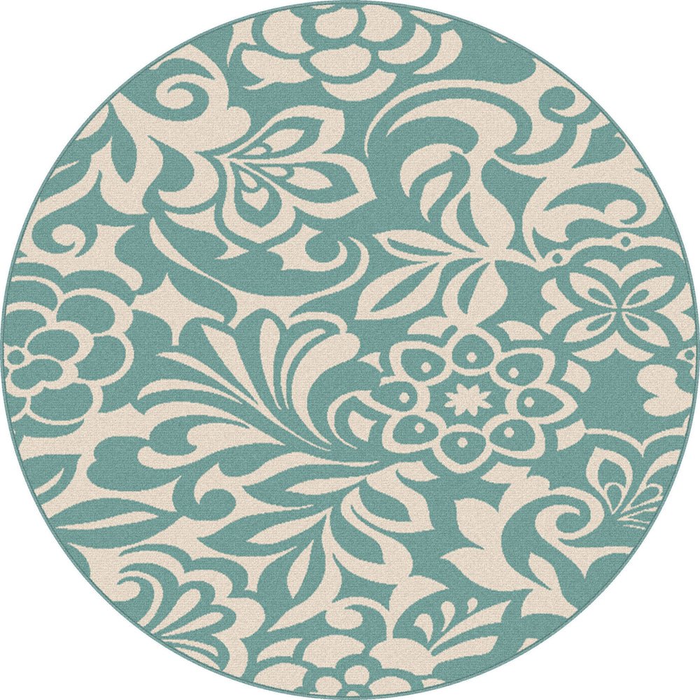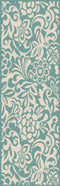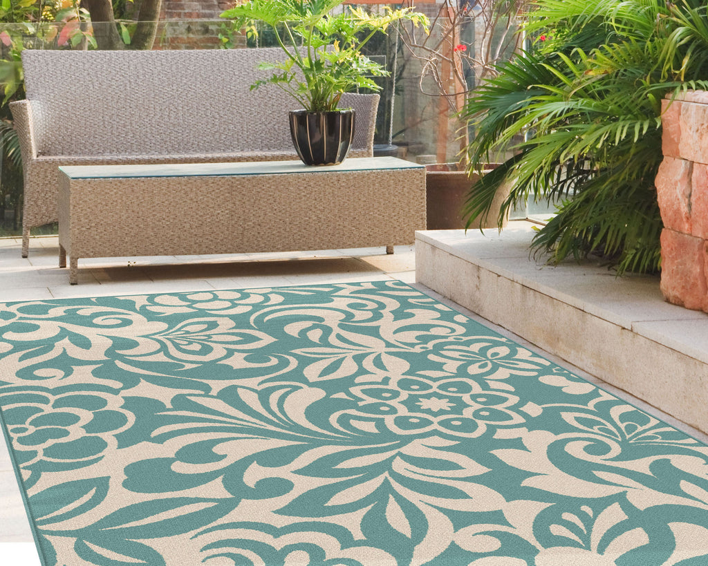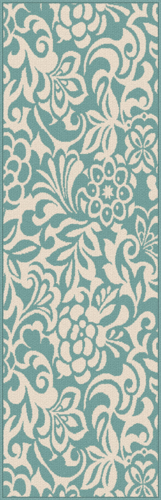 Experience a tropical getaway without leaving home.The two color design of this indoor outdoor area rug is a refreshing addition to an outdoor room or sunroom. Weather-resistant polypropylene fibers keep this rug looking great for years to come. Easy style for any type of décor. Aqua and cream.