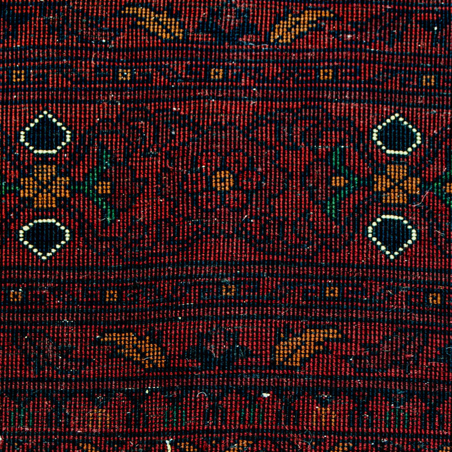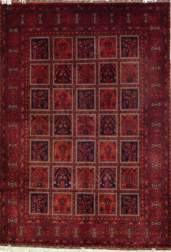 This Kahn Mohammadi rug features ravishing red details and classic motifs. Its stonewashed finish gives the different shades of red that extra dimension and appeal. Each square features beautiful floral motifs traditional to the region. Tribal patterns line the borders of the rug for a finishing touch of beauty. Add this rug to any room that needs a lively splash of color. This authentic Persian rug was handcrafted by regional artisans using the traditional Kahn Mohammadi techniques and patterns. It's made of pure wool, which makes this a lasting investment for your home. Place it in high traffic areas, and it will remain in top condition for years to come.
