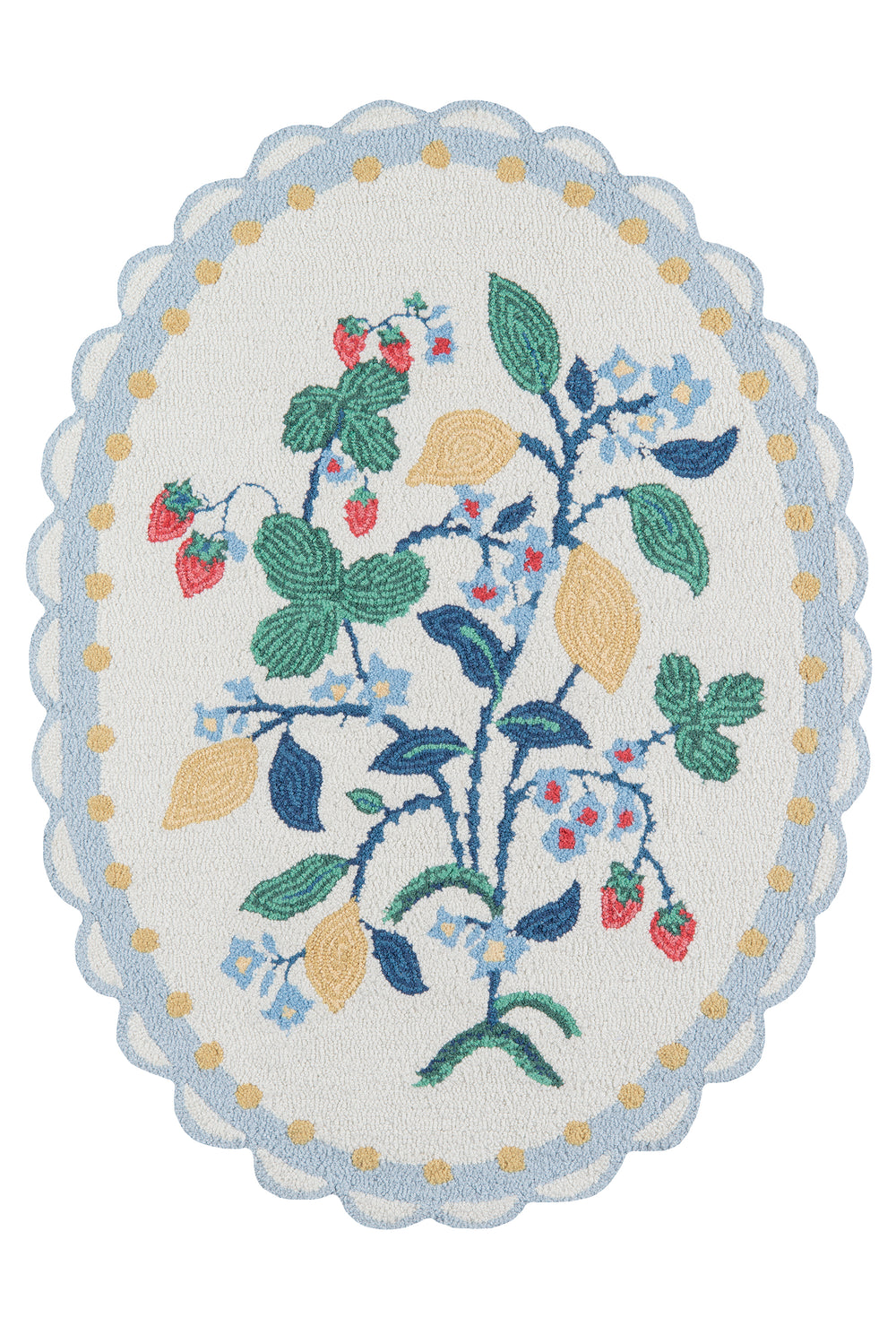 A homey knick-knack for a kitchen, bath or living room, this traditional area rug is a charming addition to interior floors everywhere. The oval-shaped accent rug is outlined with scalloped silhouette that accentuates the femininity of the multicolor floral arrangement at the focal point of the floorcovering. Each leafy green, red strawberry, yellow petal and light blue outline is hand hooked from polyester fibers in a needlepoint style that rivals antique embroidery. Family heirlooms find a sense of humor in this Madcap Cottage by Momeni collection that combines quirky sensibilities with a wink to classic handicrafts. Bring the adventure home.