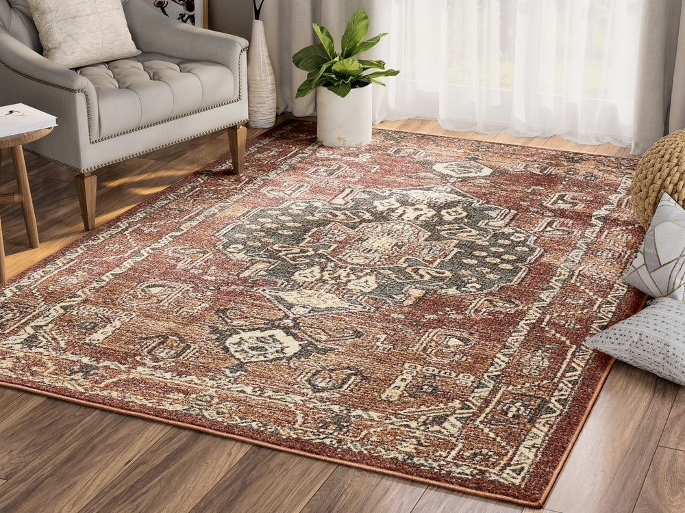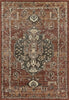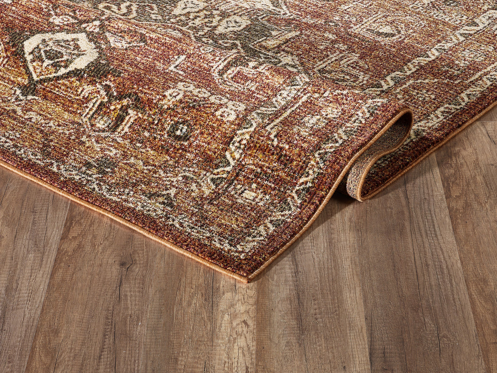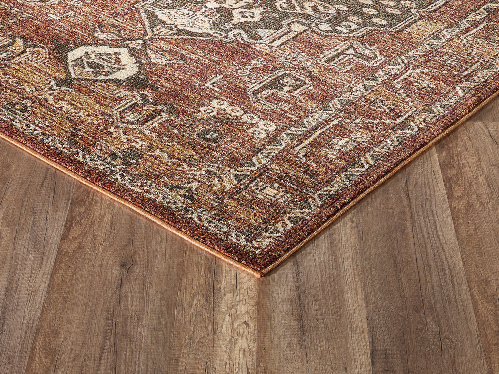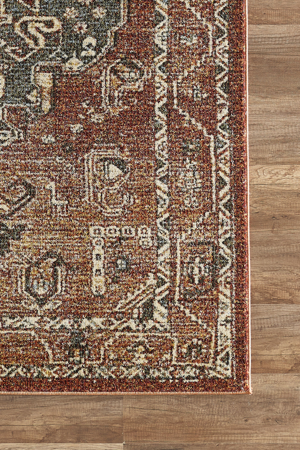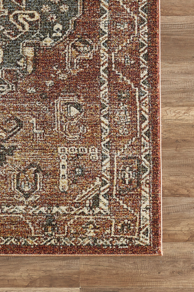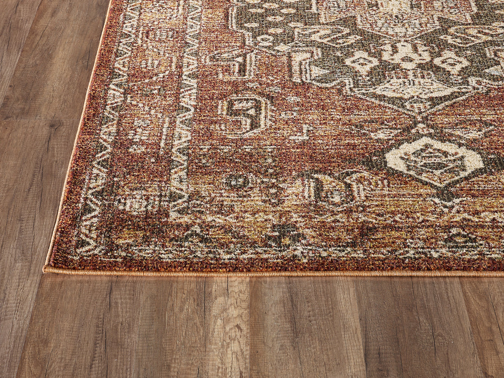 The Mesa orange rust medallion distressed rug is an unusual find that combines the warmth of the American Southwest with the imagery of oriental cultures. The rug is defined by an orange rug background and a central green brown oriental medallion. Traditional tribal motifs create a pattern bordering the central medallion. This one-of-a-kind area rug is easy to care for, and it will add a rich history to your interior design style.
