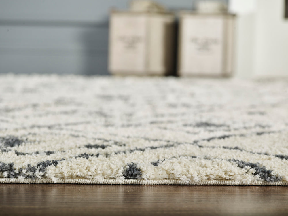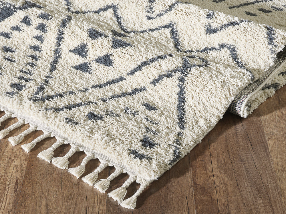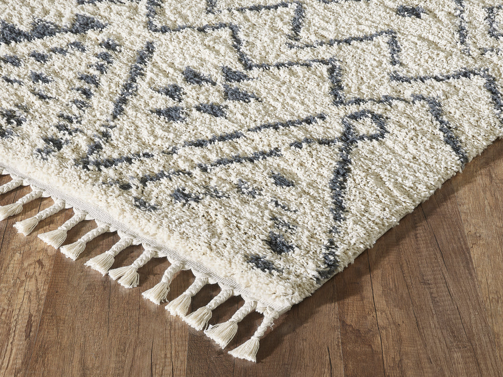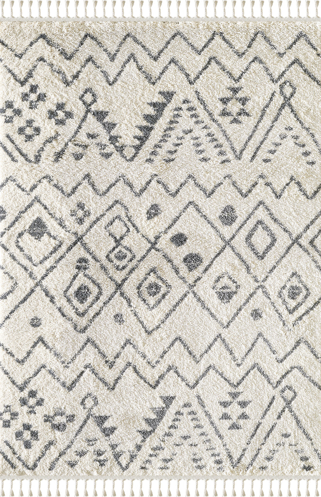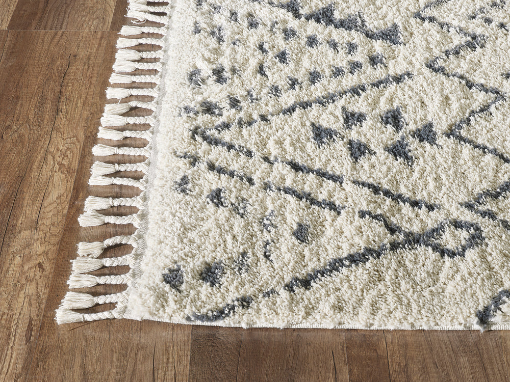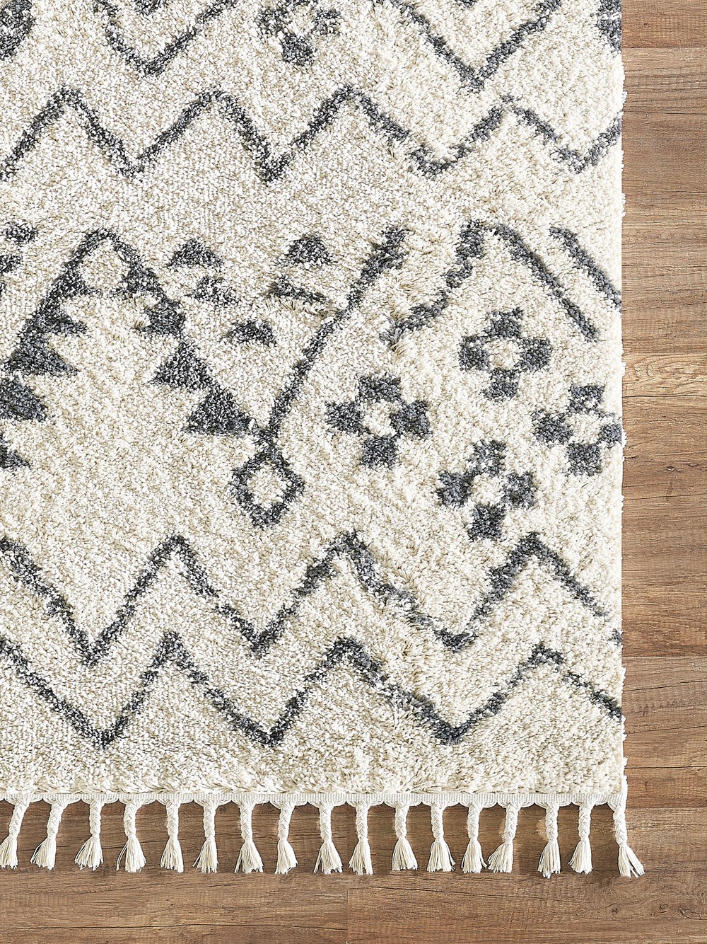 The Willow Morocan tribal print area rug has the characteristic cross cross and zig-zag pattern Moroccan rugs are known for without compromising on its modern aesthetic. The mix-matched grey patterns and shapes spread over an off-white background reinterprets Moroccan patterns for 21st century interior design. The shag style softens this bold design with plush comfort, making your home a warm, welcoming place. Add contemporary flair and traditional style to any room in your home. With this on-trend, easy-care area rug, your home will transform into an oasis of style and comfort.