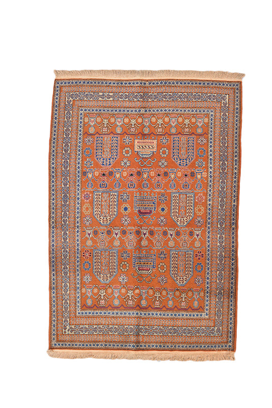 Get a wholesome feeling with this carefully crafted Turkman area rug, modeled after the Afghani style! Hand-knotted using high-quality wool, this shows up the unique craftsmanship through its flawless weaving in bright shades of red, beige and brown. With its dome-like geometric motifs as its repeated patterns, this rug looks vibrant, translating ancient symbols into works of art. Tribal weaving, durability, dominating shades and several artistic expressions are some of this Afghan rug’s specialties. Spreading this open on your floor is sure to gather envy from your friends and relatives. In short, this rug has a timeless pattern, which will make it the most cherished possession of any proud owner.