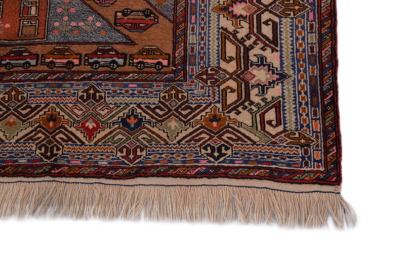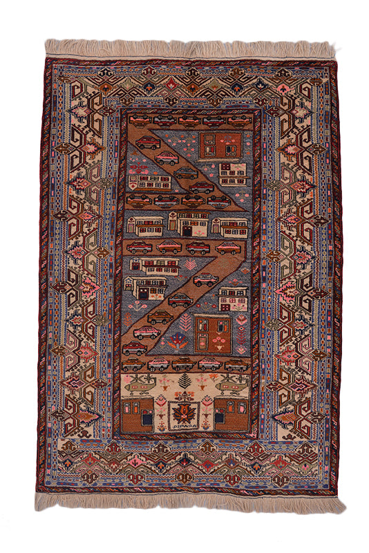 The perfect way to add a unique factor to your interior decor using tribal art pieces, this Baluchi rug in muted tones is the ideal example of a traditional carpet dominated by dark color tones. Featuring a fine weaving of 100% pure wool for durability and softness, this Persian rug demonstrates the excellent value of the exceptionally beautiful art work of this tribe. This tribal rug has a special character and personality that makes it easy to live with in contemporary homes. It is sure to delight anywhere, family room or bedroom or even the dining room. A landscape design featuring cars and buildings in rows accentuating the muted and bright shades of brown and beige make this carpet stunning.