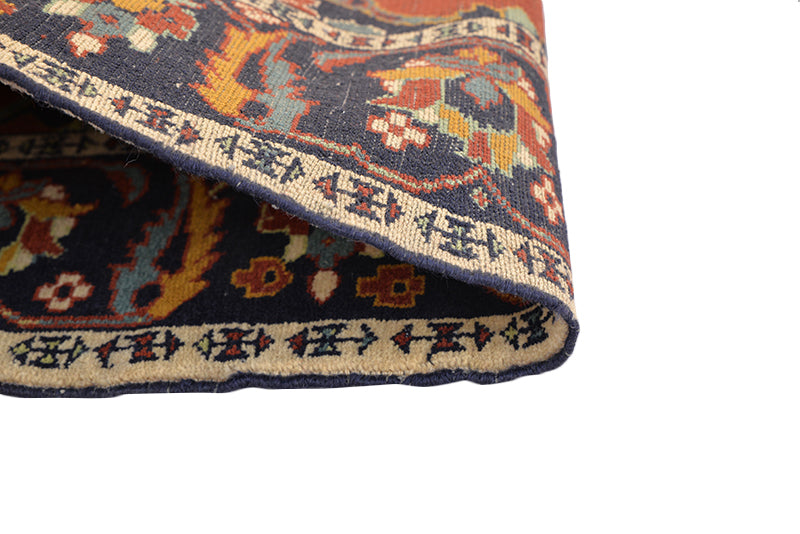 Woven with intricate floral design patterns, this antique Derband rug features refined, exquisite details. The selection of warm tones in rusty red contrast subtly with and offset by dark shade of blue. The symmetry characterized by this Persian rug is accentuated by the detailed border encompassing this magnificent pure wool rug. The core design in plain red features an elongated medallion in dark blue populated with symmetrical floral motifs in beige. This rich design and color tones give this Persian rug a luxurious feel that is breathtakingly exciting. The more a person spends time with this soft rug, the more he will appreciate about its uniqueness and rarity.