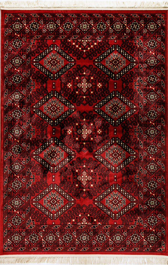 The elegance of the Crown collection is unmatched. The curvilinear baroque designs, reminiscent of classic Persian designs, placed against the strong red viscose background creates a royal ambiance for the aptly named Crown collection. Yet, given its soft touch and the shift in strength of color depending on the angle of which it is looked upon, the collection manages to walk the line between being regal and being delicate. The fringe on both ends in conjunction with the design and color strengthens how classic this look is. Crown is 100% viscose, machine-made in Turkey.