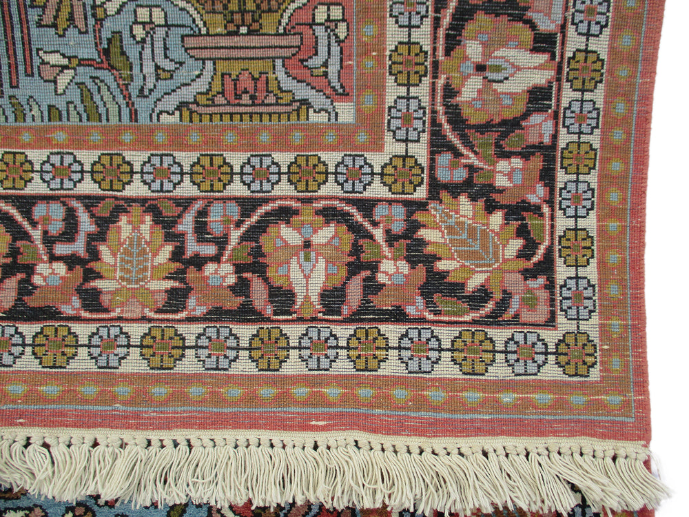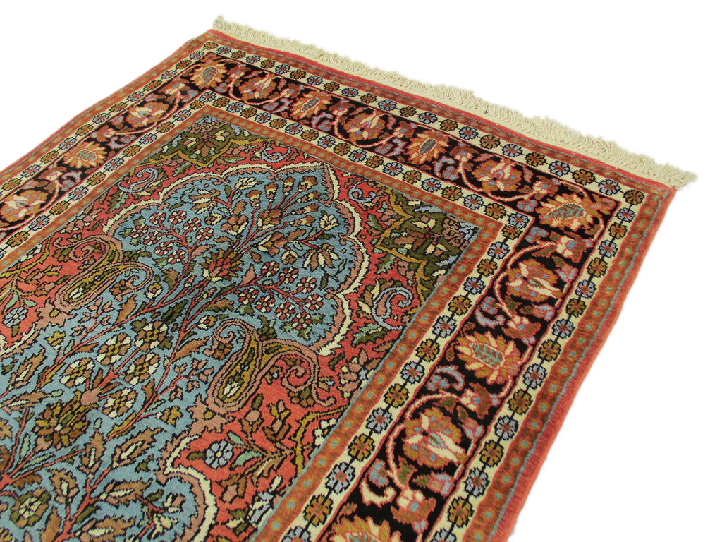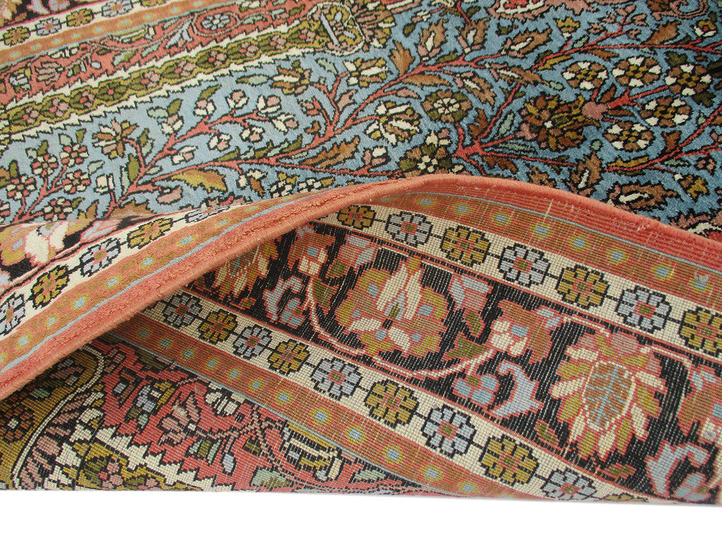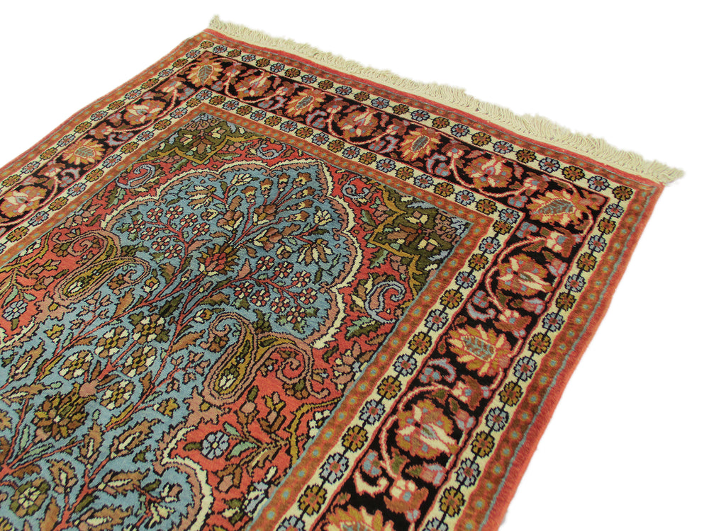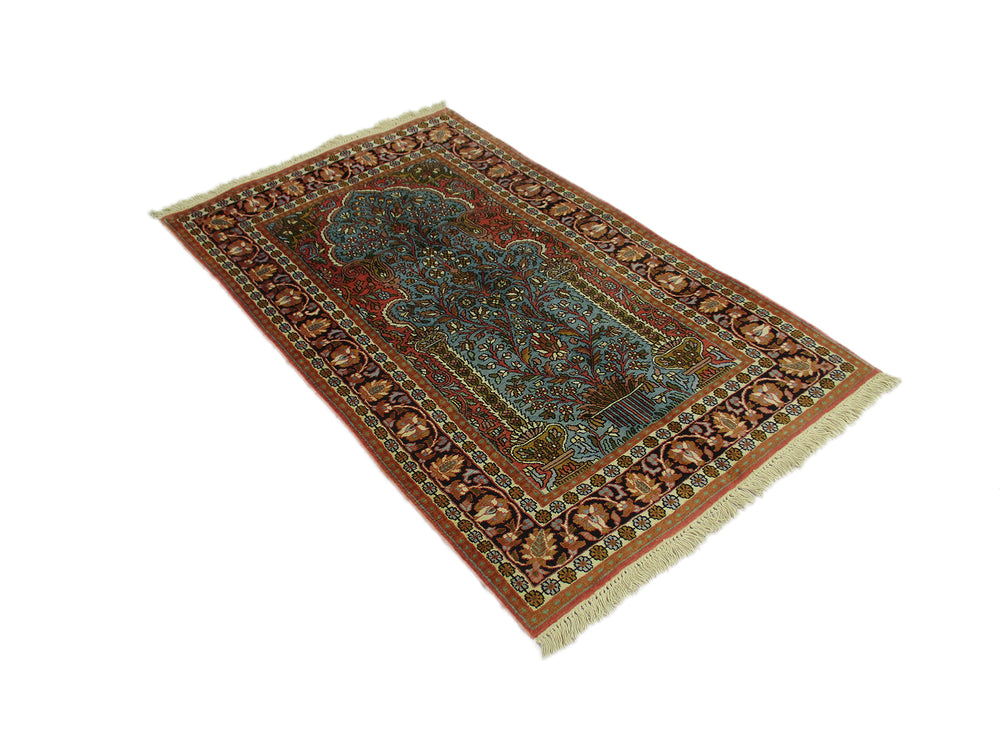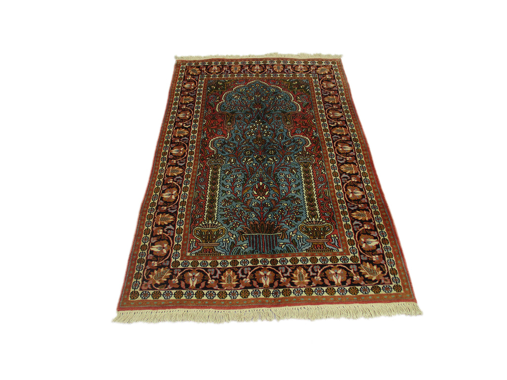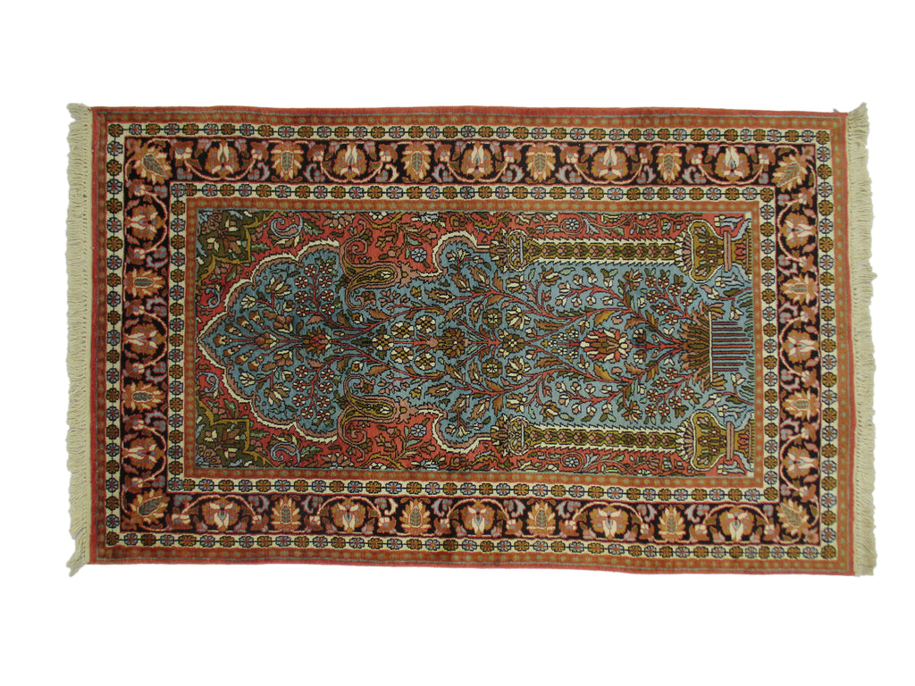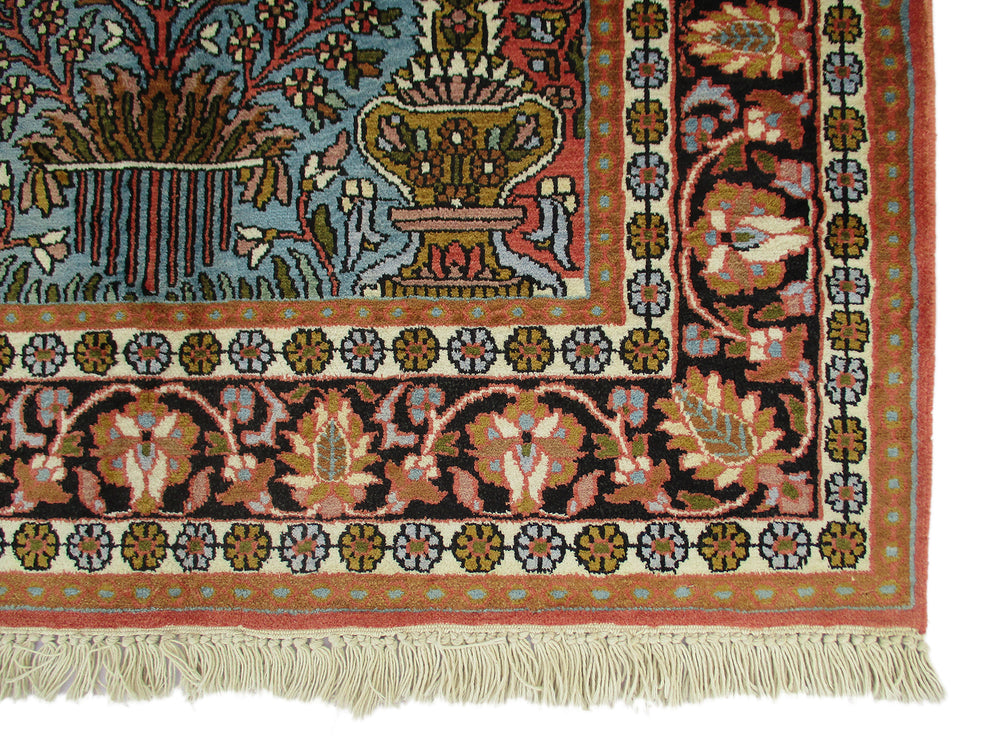 Astonishingly beautiful looking Indian DK area rug, exhibiting unique oriental design of Indian craftsmanship along with appealing shades in a garden theme, rich in beauty and style to make your home a real happiness. Certainly, a precious treasure to have one in your home, which is hand knotted and designed with plenty of motifs around the large centre medallion, with contrasting shades to make it all the more an attractive floor piece to compliment your living room decor. Made of high quality oriental silk, measures 3’0” x 5’0” in a combination of turquoise, red and orange, which is beyond doubt adds style quotient to your room. Indeed, a most desired rug for its finest finish, oriental in design, discernibly majestic Indian look, unique all-over design, durability, a decorative floor piece to enrich the beauty of your home.