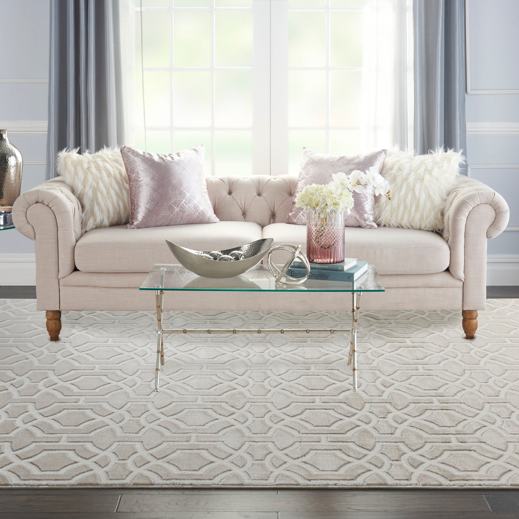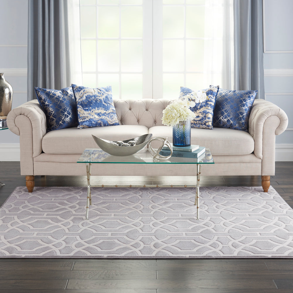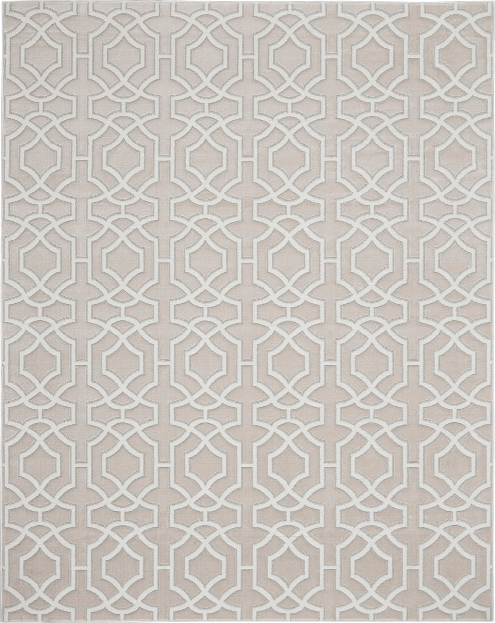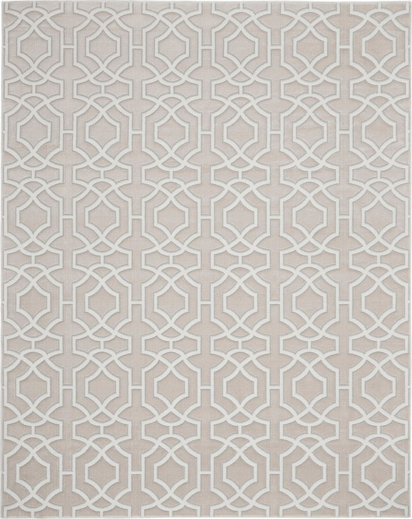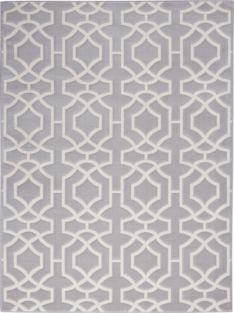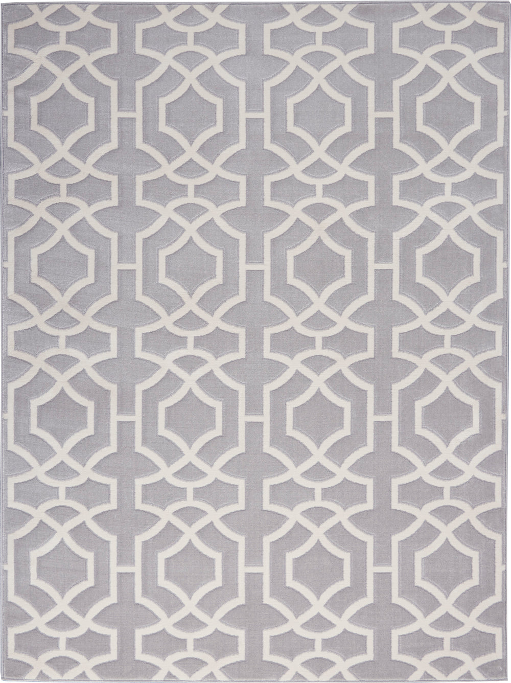 A crisp and elegant latticework design gives this Joli rug a hint of Moroccan fantasy in a modern look. Its invitingly soft grey and white color scheme is ultra-versatile. This rug is both power-loomed for low-shed, low-pile appeal in a modern fiber blend.