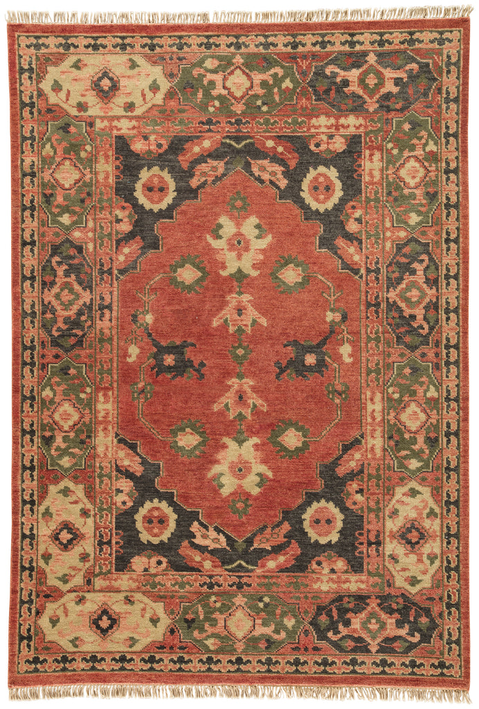Traditional motifs meet rich hues in a striking and updated design on this hand-knotted area rug. In on-trend terracotta red, black, and green, the floral medallion pattern of this wool accent offers a dynamic and globally inspired focal point in chic living rooms and dining spaces.
