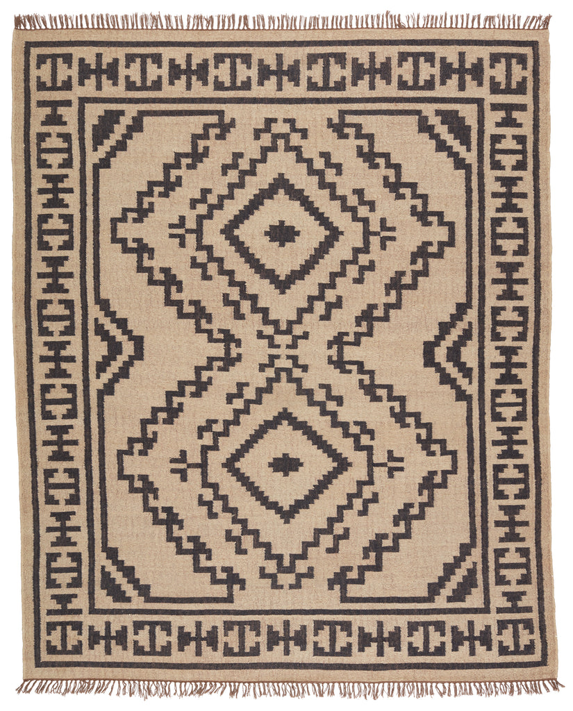 The globally inspired Bedouin collection features an assortment of Southwestern styles that are designed for the contemporary home. The handwoven Jaima rug offers a fresh take on a bold and open tribal medallion in easy-to-decorate colors of light beige and deep black. Crafted of durable and texture-rich jute, this natural, flatweave rug grounds spaces and adds a worldly vibe to any room.Care Instructions