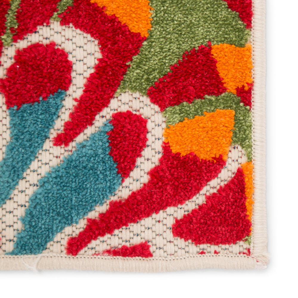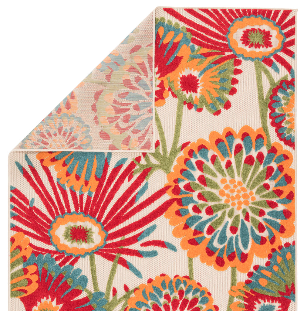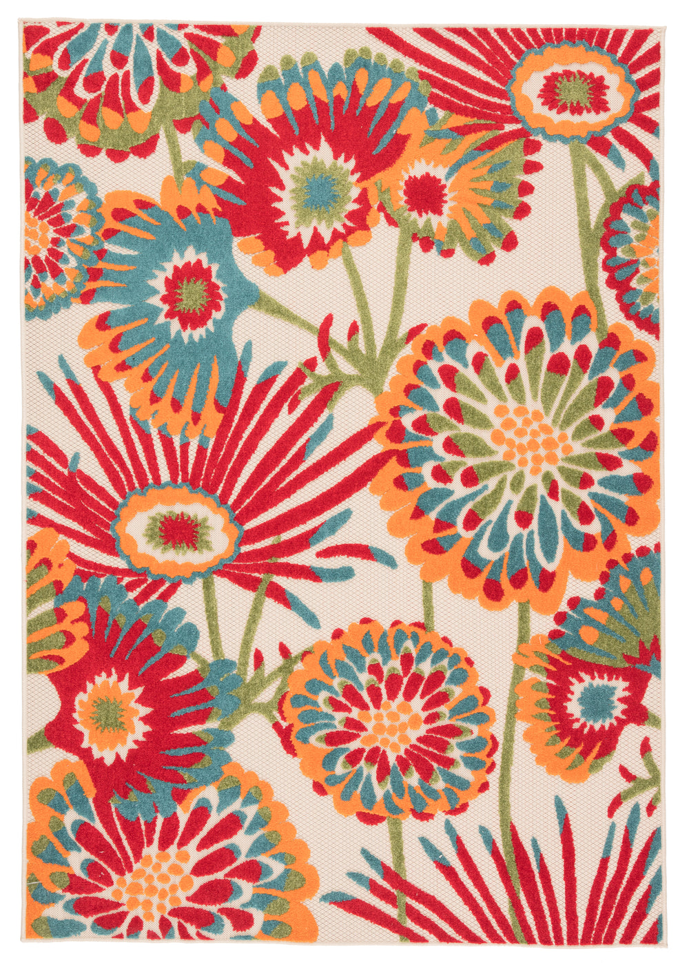 The Belize collection is the perfect combination of retro style and vibrant colors for outdoor and indoor settings. The Balfour design's bold blooms suit any contemporary patio or high-traffic area with a durable construction of soft, easy-to-clean polypropylene. Red, orange, blue, and green flowers pop on the neutral cream background, while the raised texture highlights the garden-fresh pattern.
