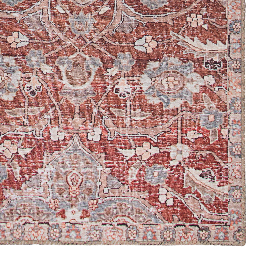 A unique combination of antique rug designs and the durability of an indoor/outdoor construction, the Chateau collection offers vintage vibes to any space. The traditional Aden rug boasts an intricate Turkish pattern of elegant fleurettes in a brick red, pink, and gray colorway. This zero-pile rug is made of weather-resistant polyester for a flat, durable finish.Care Instructions