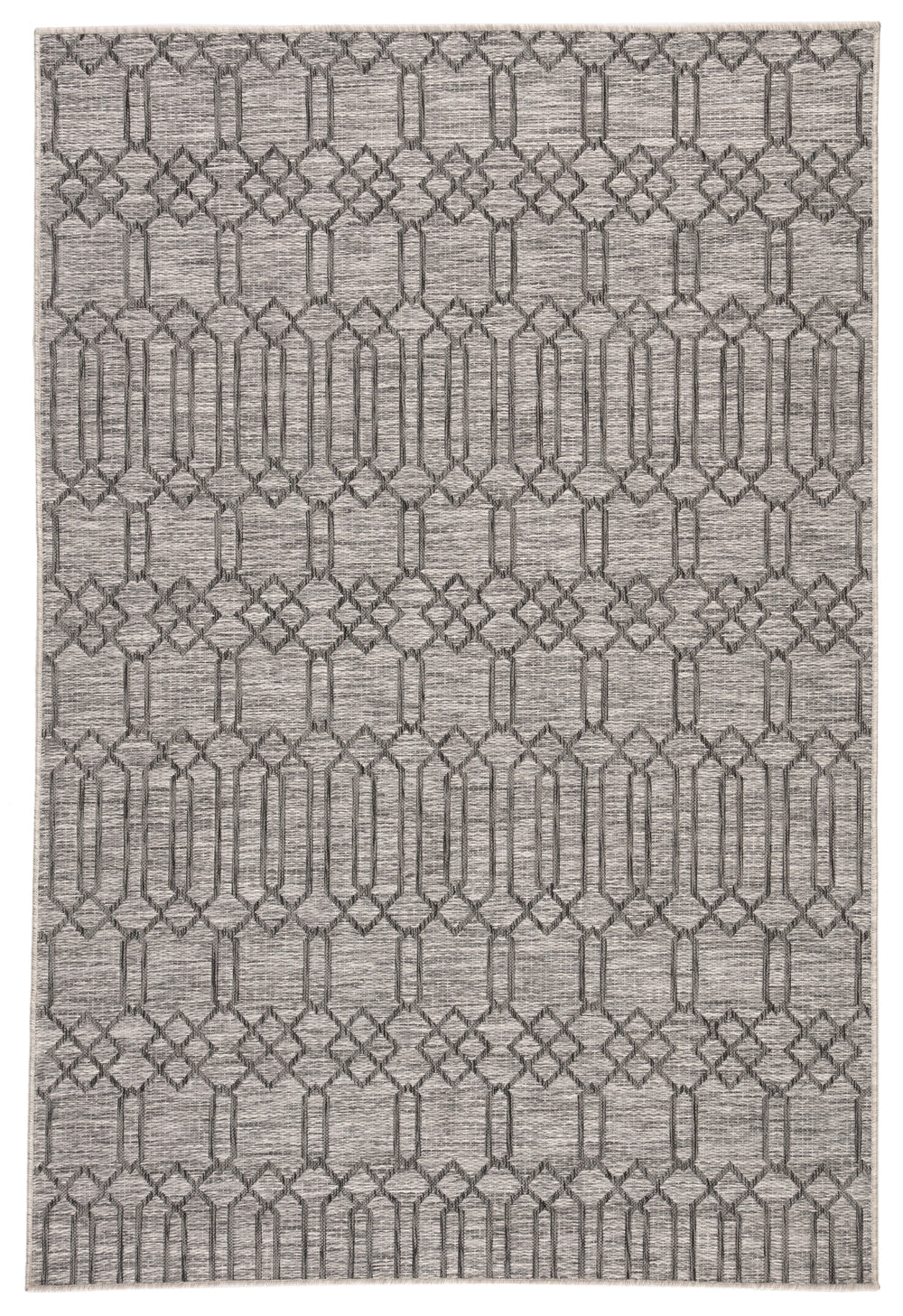 The Decora Calcutta power-loomed area rug designed by Nikki Chu features an eye-catching lattice design and sleek heathered charcoal and light gray colorway. This durable and texture-rich layer withstands high traffic and outdoor elements, perfect for well-used living spaces and patios alike.
