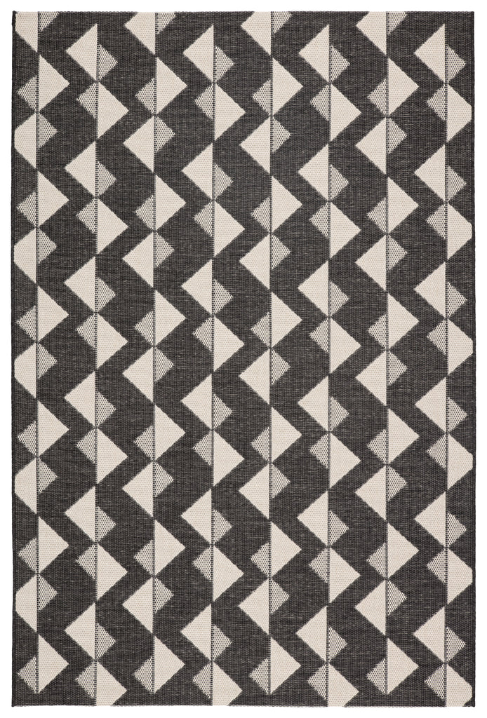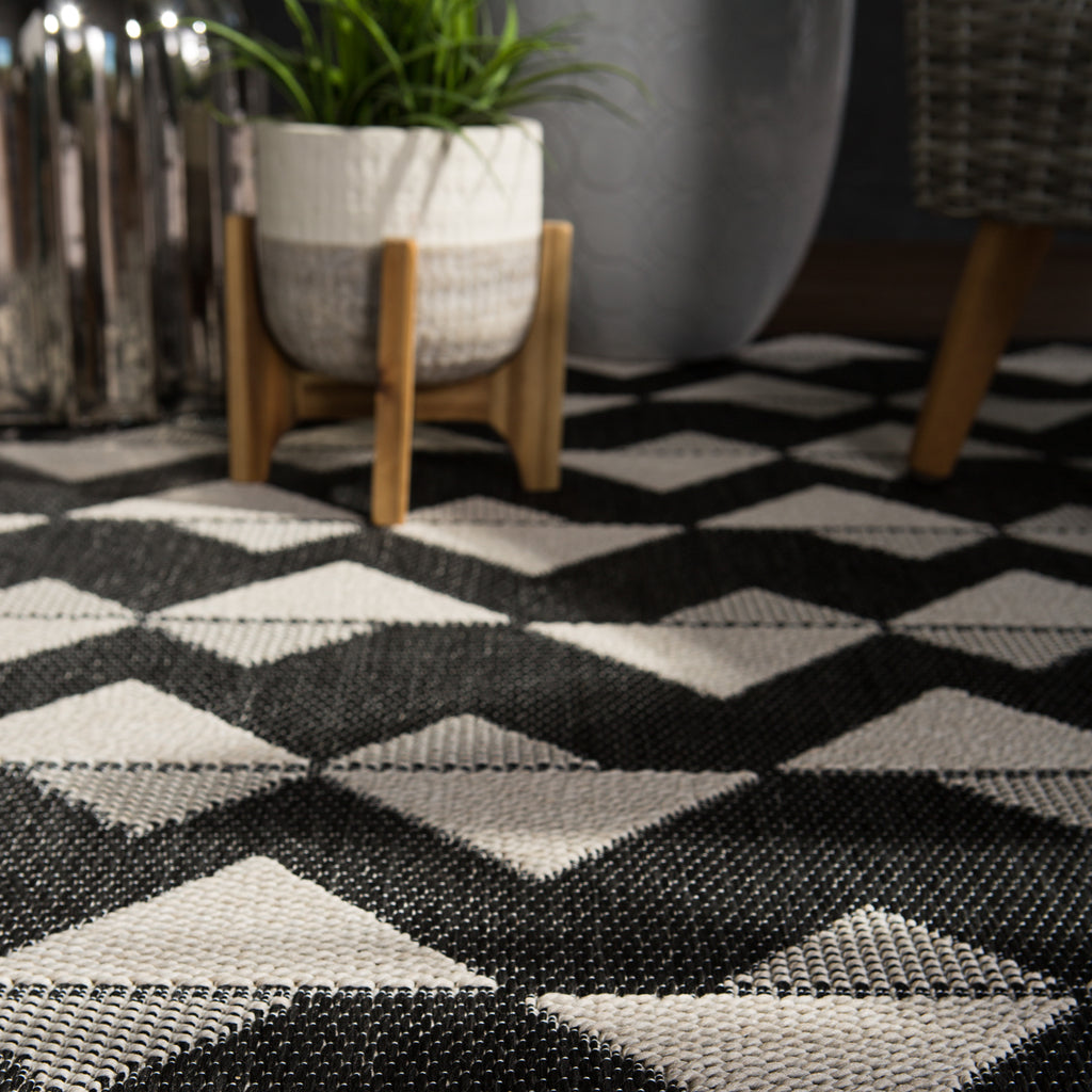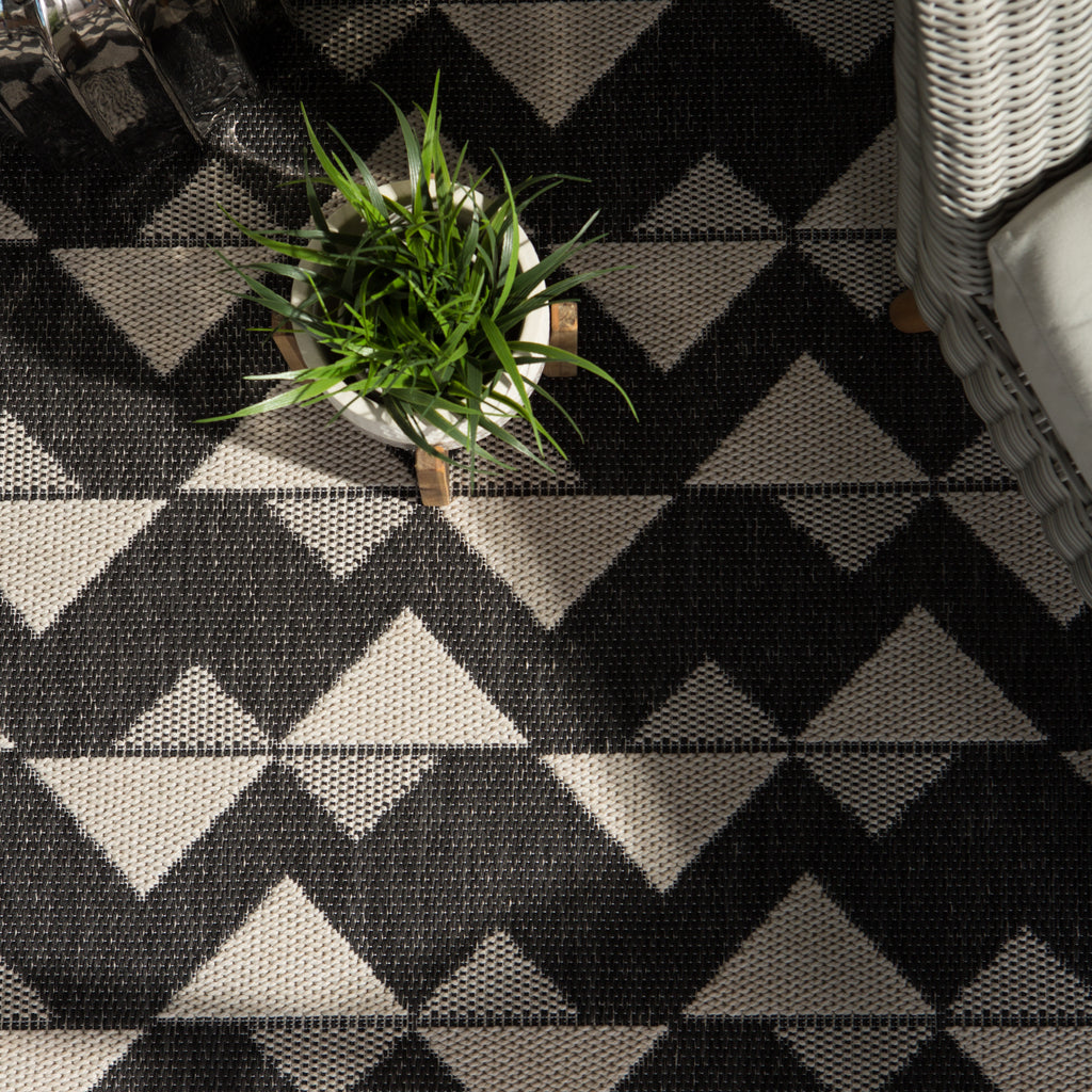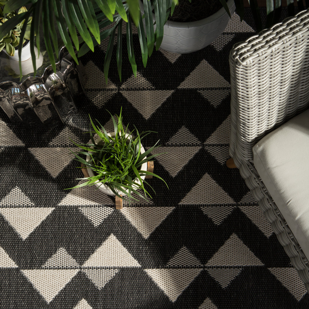 The Fresno collection lends a relaxed, casual feel to outdoor spaces and high-traffic indoor areas. The black and cream-colored Zemira area rug features an asymmetrical triangle motif that creates a global look and unique texture. Made of durable polypropylene and polyester, this flatweave rug offers versatility and an easy-care foundation to any space.Care Instructions