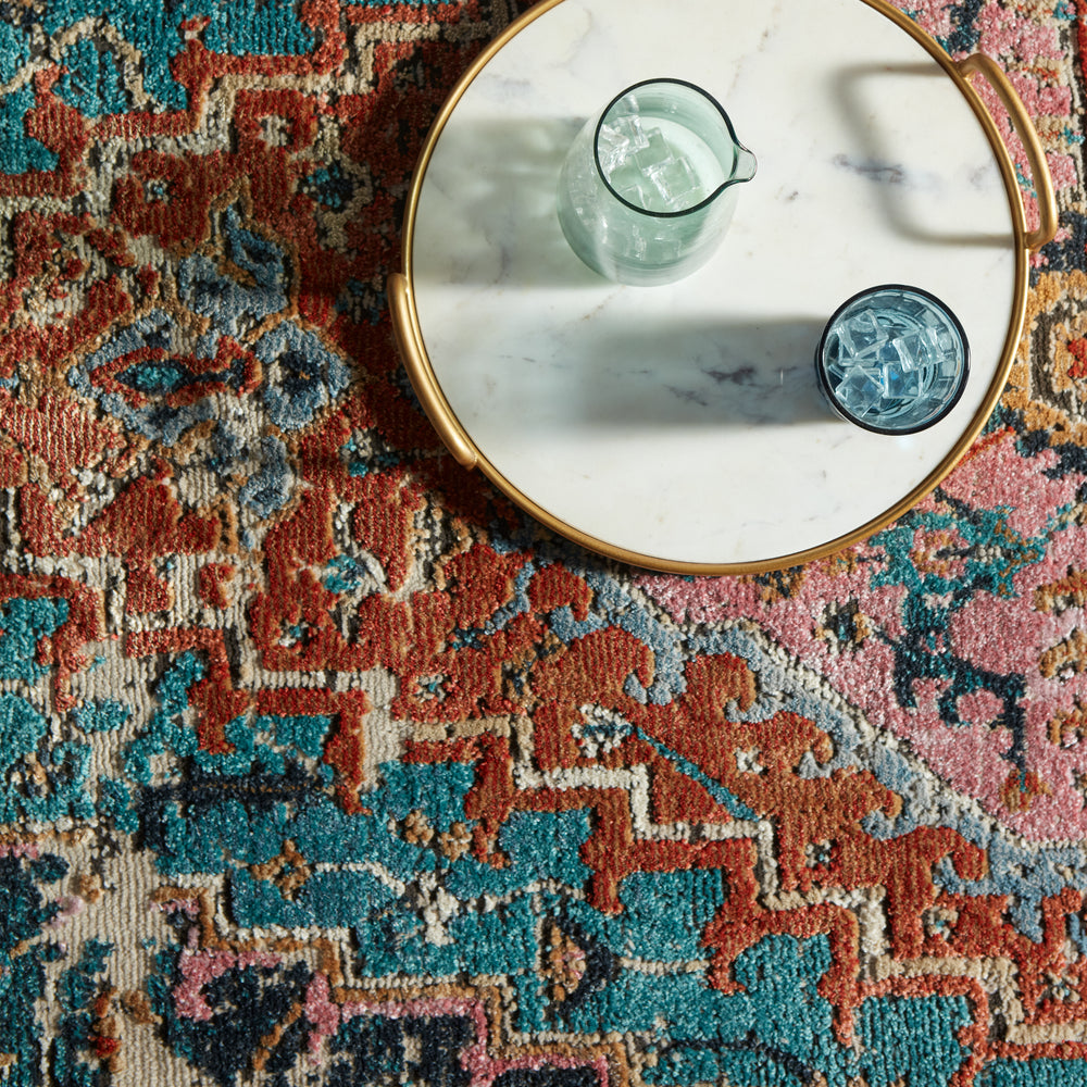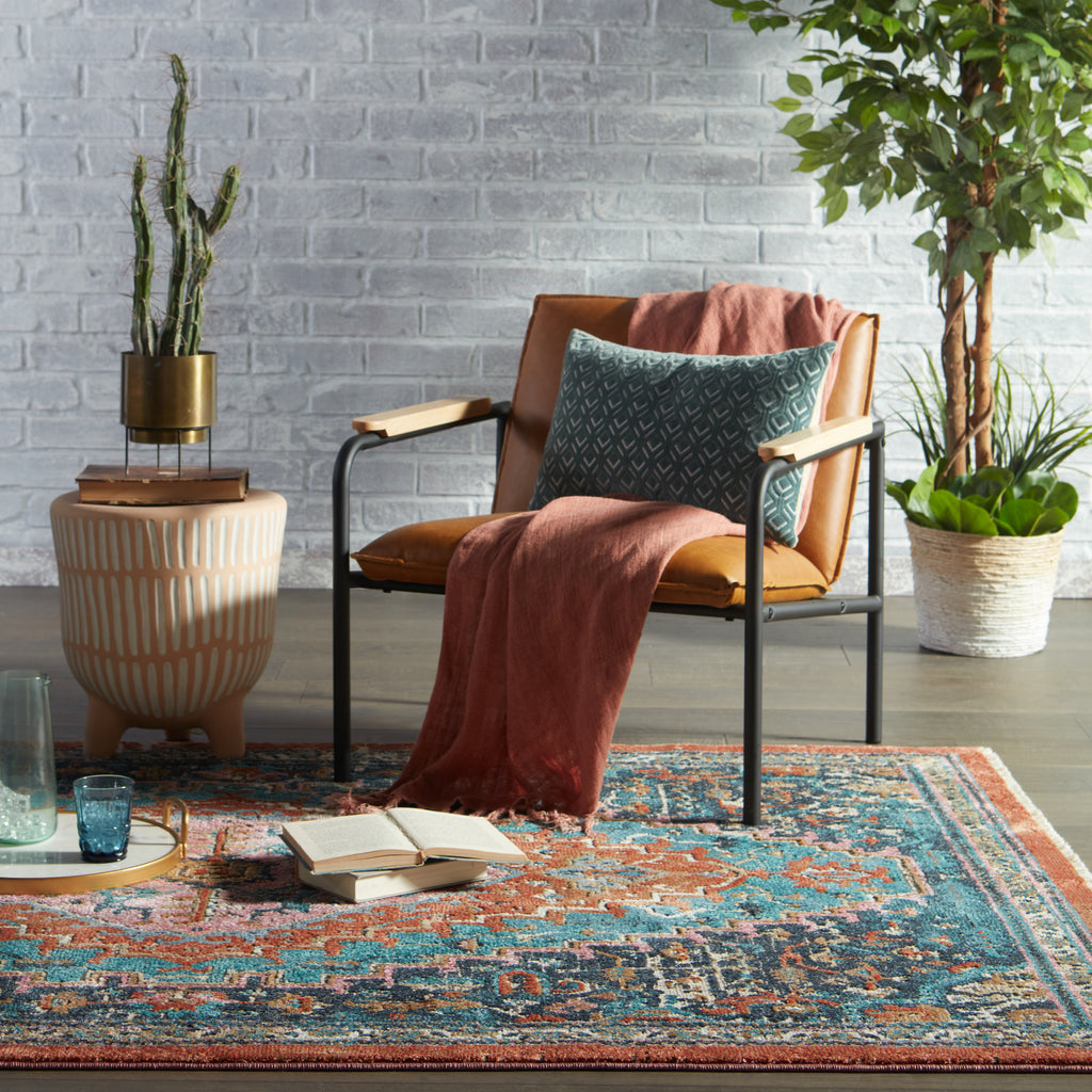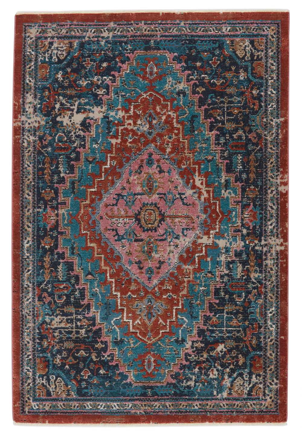 Inspired by the vintage perfection of sun-bathed Turkish designs, the Myriad collection is warm and inviting with faded yet moody hues. The Marielle rug boasts an elegantly distressed, bohemian medallion in tones of teal, blue, pink, and rust. This power-loomed rug features a plush and durable blend of polyester and polypropylene, lending the ideal accent to high-traffic spaces.Care Instructions