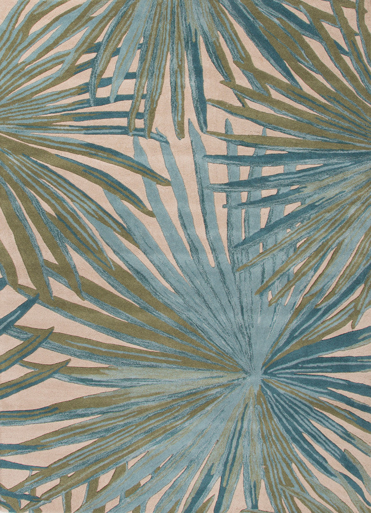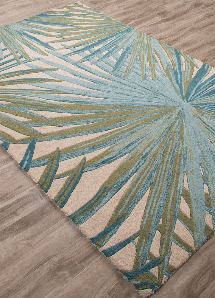 Striking a perfect balance between style and go-barefoot coastal comfort, this hand-tufted, plush pile rug in 100 percent wool with a palm frond motif in shades of fog and smoke blue, marries soft hand with durability.