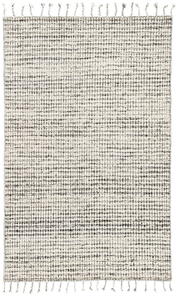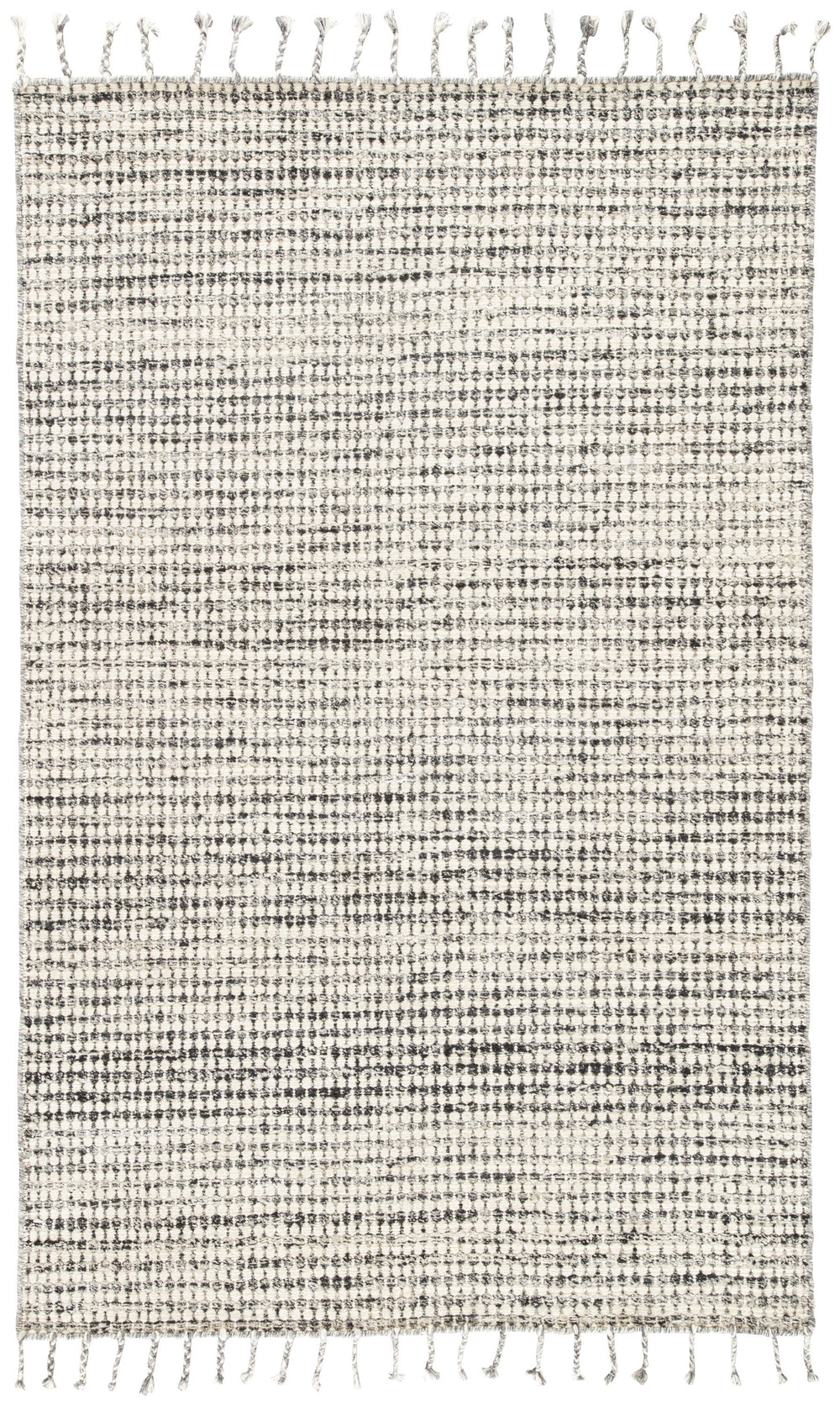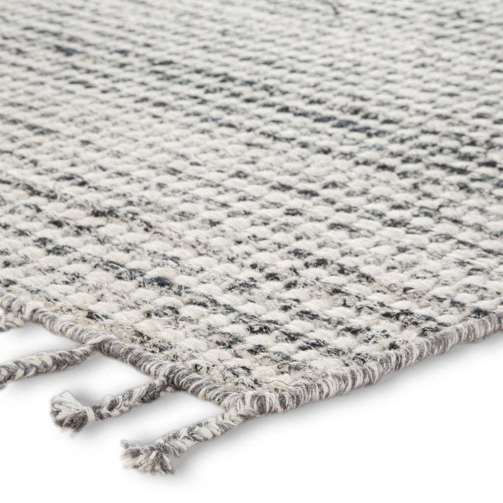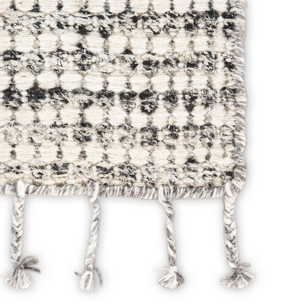An eco-friendly flatweave made of fine quality wool and recycled sari silk, the Tamil Perkins rug brings one-of-a-kind charm to transitional style spaces. The deep black and ivory color palette creates stylish contrast on the intricate repeating pattern, keenly accented by braided fringe for a worldly bohemian touch.
