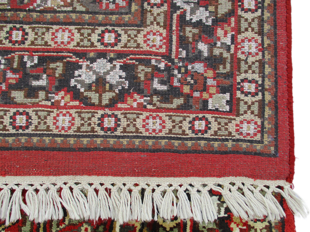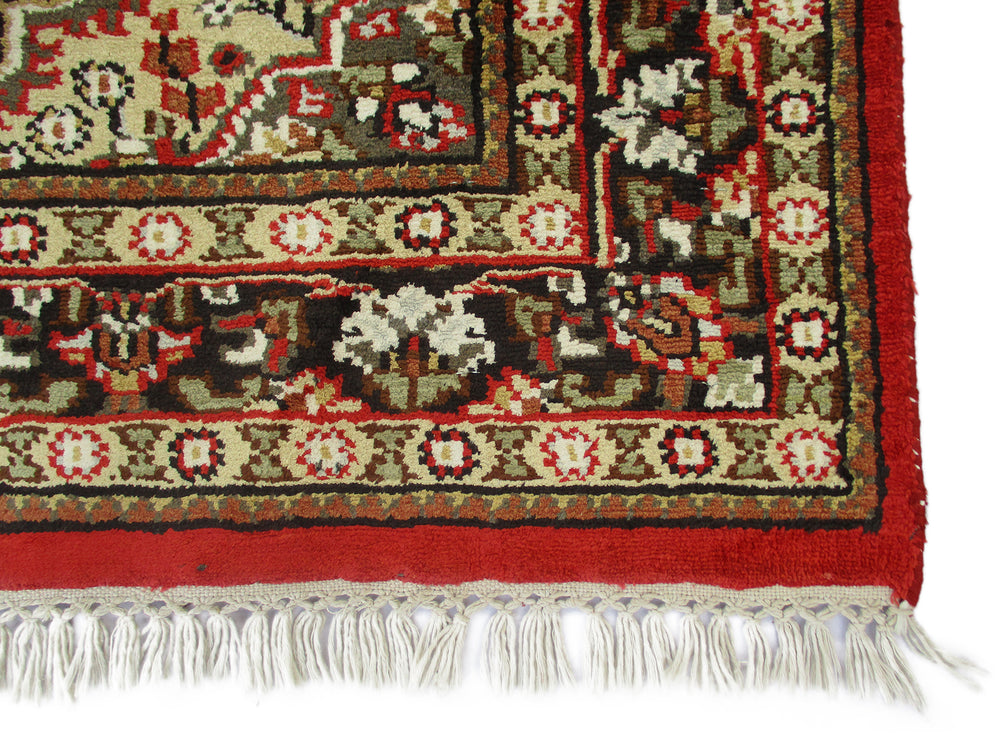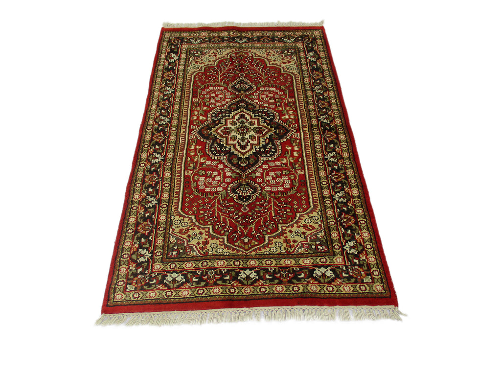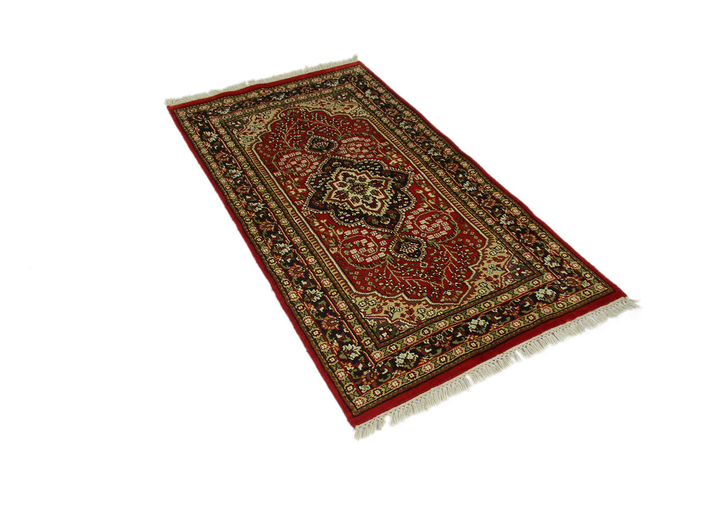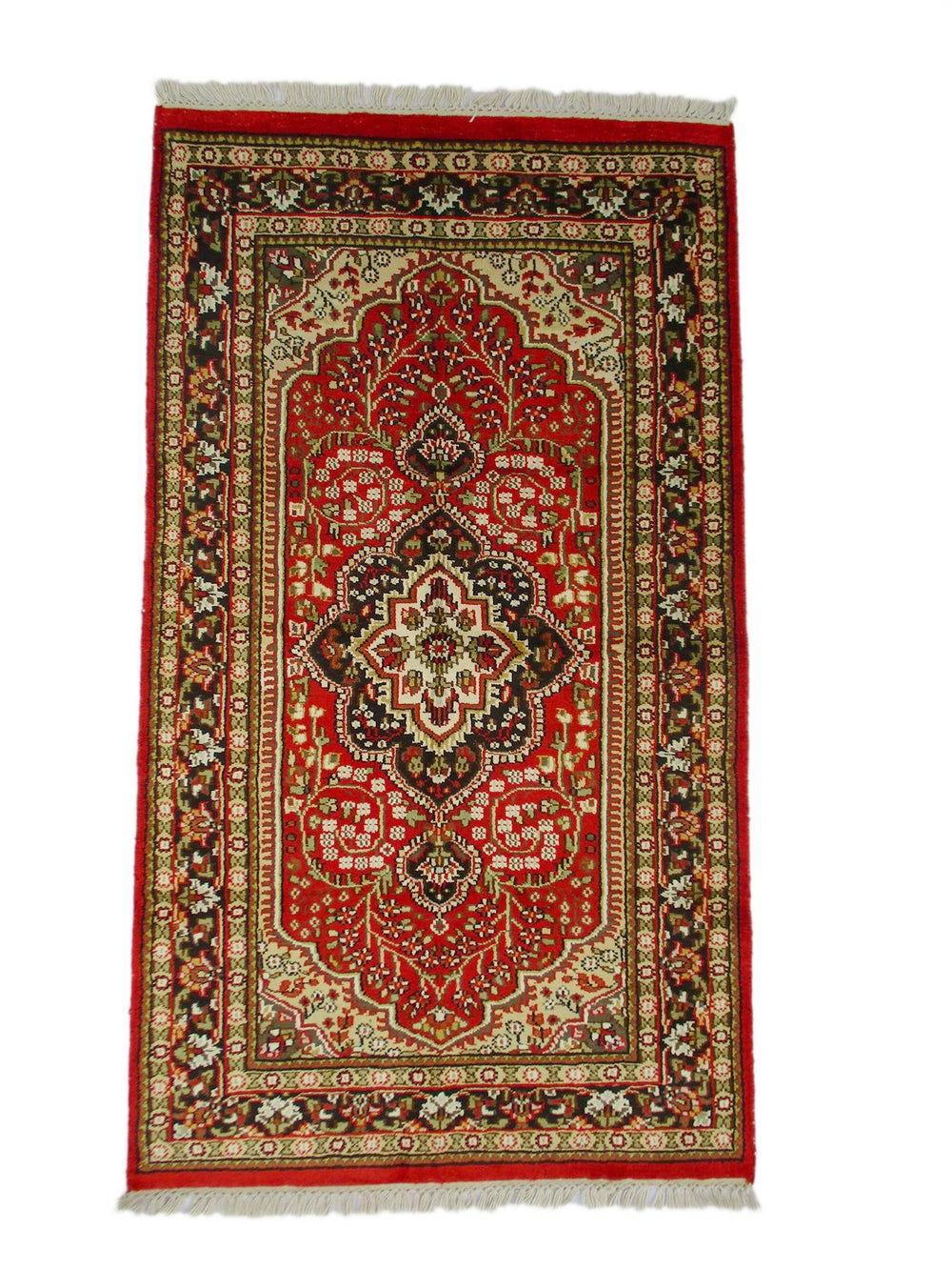 Augment the look of your room, with this Jaipuri cotton and silk rug designed with prominent red and black shades that sets the standard for quality rug. Traditional design of Jaipuri rug creates the sensation of the tale of Indian community, using symbols of art, culture and tradition to enrich the beauty of your living room, available in 2'10"x5'0" dimension, with contrasting colors of red and black border to augment the brightness of the room. Check out the traditional weaving, the dominating black shades in the middle with red outer layer that makes the rug very distinctive, which is typically the oriental style of Jaipuri rugs. Overall, this rug has all the features to amaze your guest with its oriental design, a must grab to complement the look of your living room.