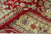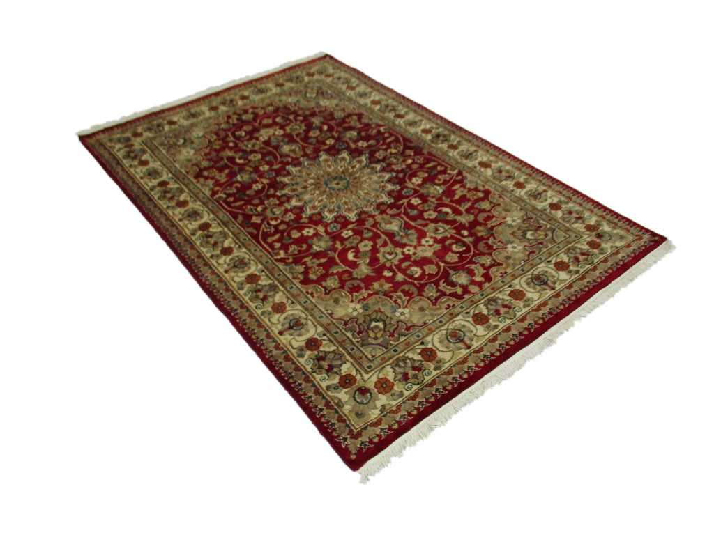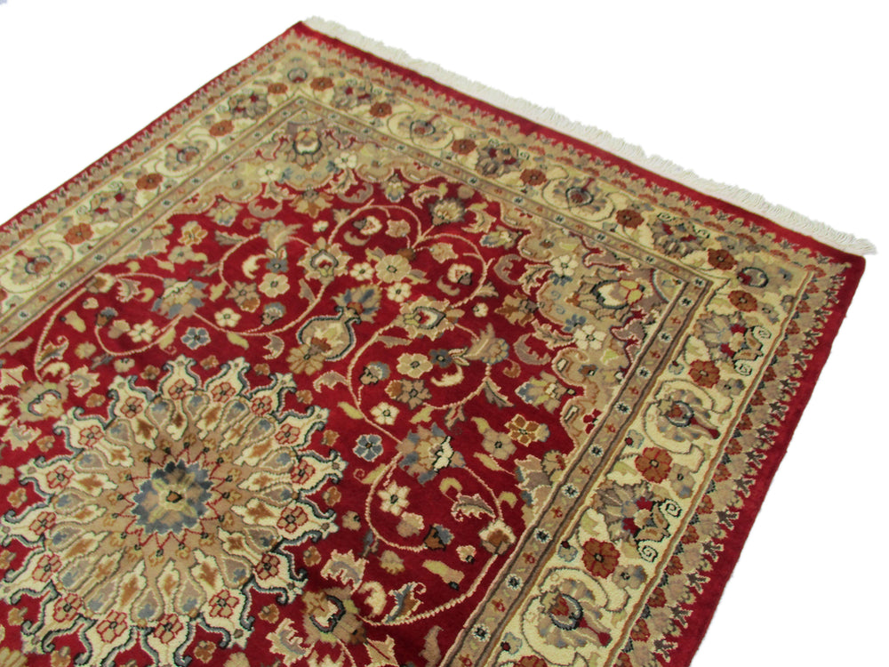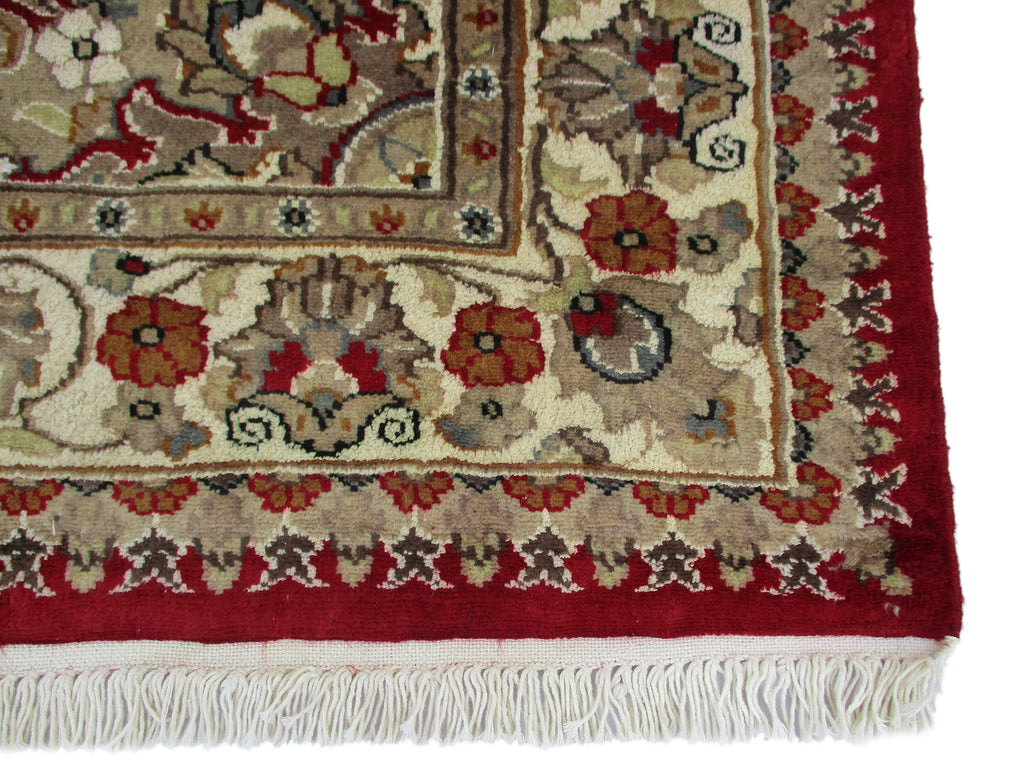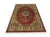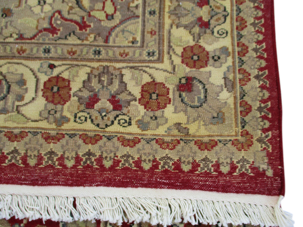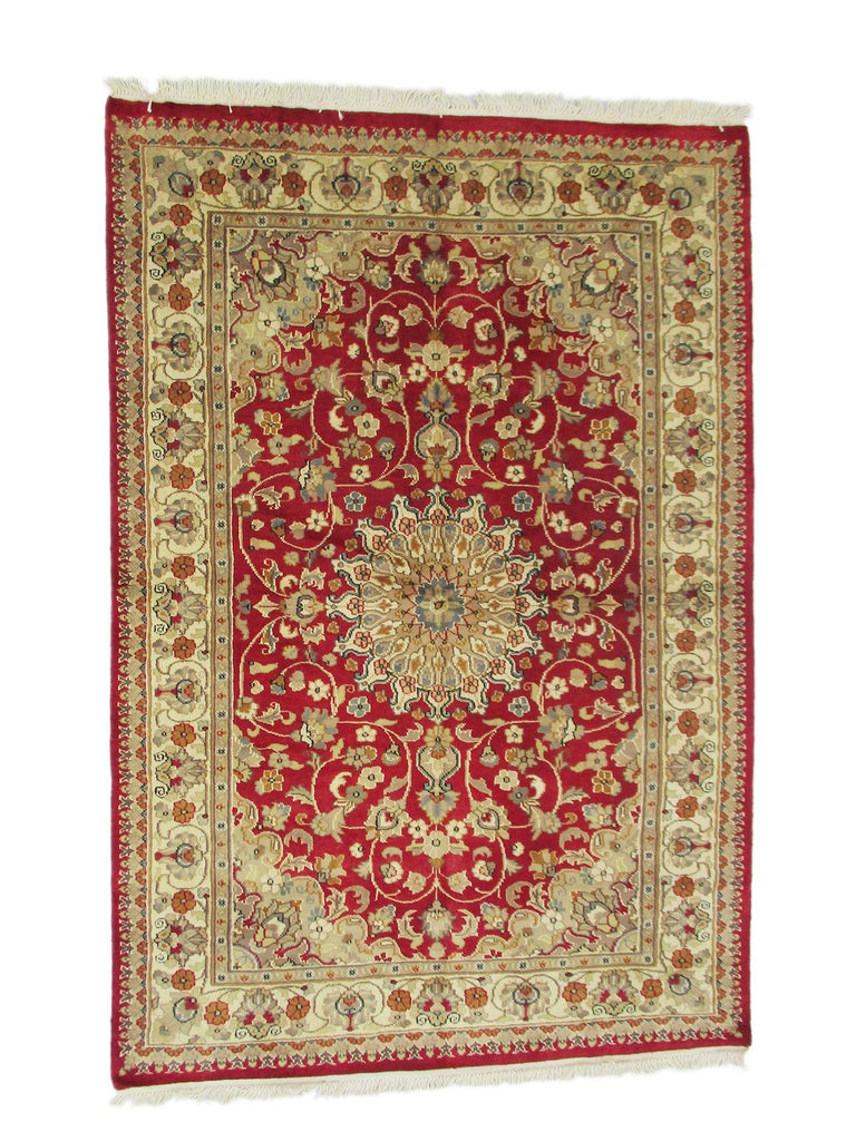 A blooming circular decal with pendant details bursting with muted tones of beige and gold embellishes this Karachi rug hand-knotted in silk and wool against a rich, regal beige background. This Persian rug emulates an aura of luxury and royalty with its intricately woven, interconnecting florets scattered all across the field provide an ambiance of regality and grandeur. A center field in red background decorated with floral motifs in shades of pink, beige and blue surround the central medallion forming an eye-catching contrast with the light shade borders. Crafted in high-quality silk and wool by skilled artisans, the Persian rug offers a velvety softness and luster that adds a new spark to your interior.