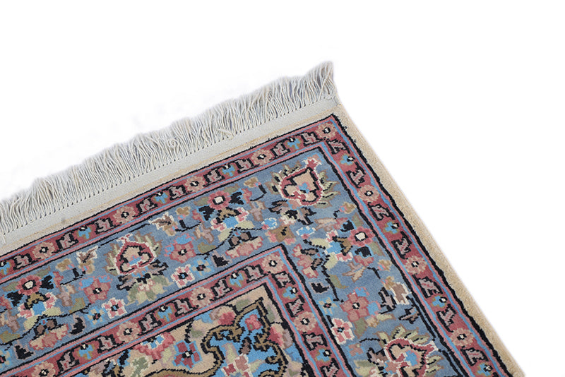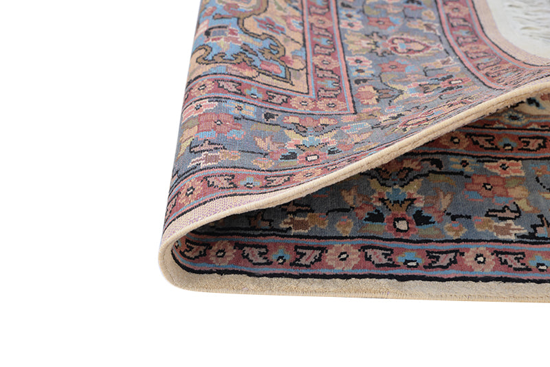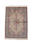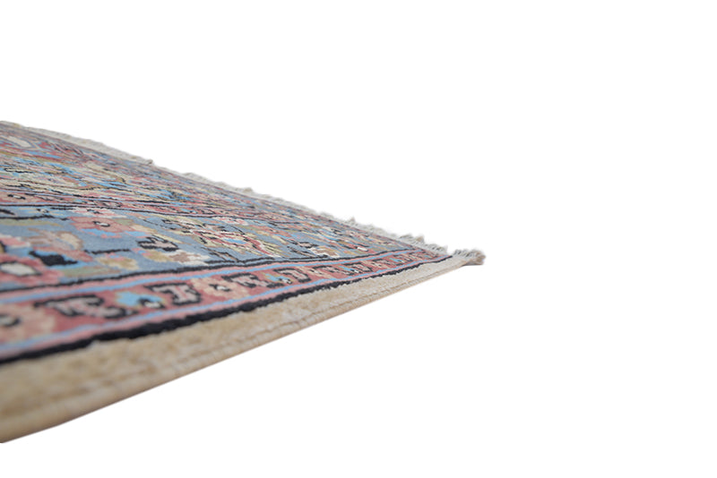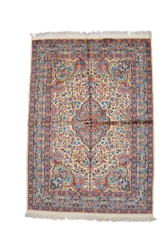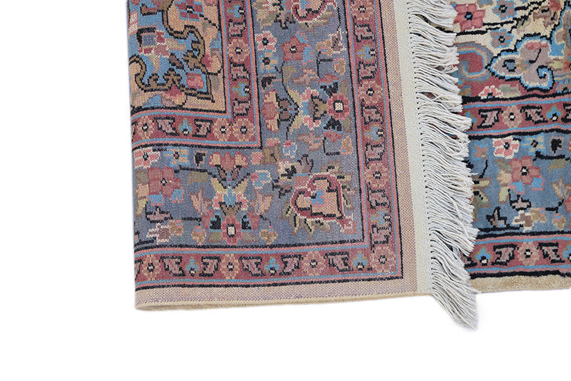 This extremely decorative antique floral rug comes from Karachi woven using one of the oldest and the most esteemed weaving techniques. In a stunning display of vivid combination of color, the rug features a graceful medallion filled with an assortment of blossoms in hues of a garden including pink, blue and lavendar. The field's blooming abundance continues throughout the borders and cornerpieces in soft tones of beige and purple. The overall floral pattern and the abundance of hues used in creating this Persian rug increase its beauty and appeal to impress any visitor. The rug is 5'10" long and 4'2" wide and is ideal to be laid on any floor and it blends easily with any decor.
