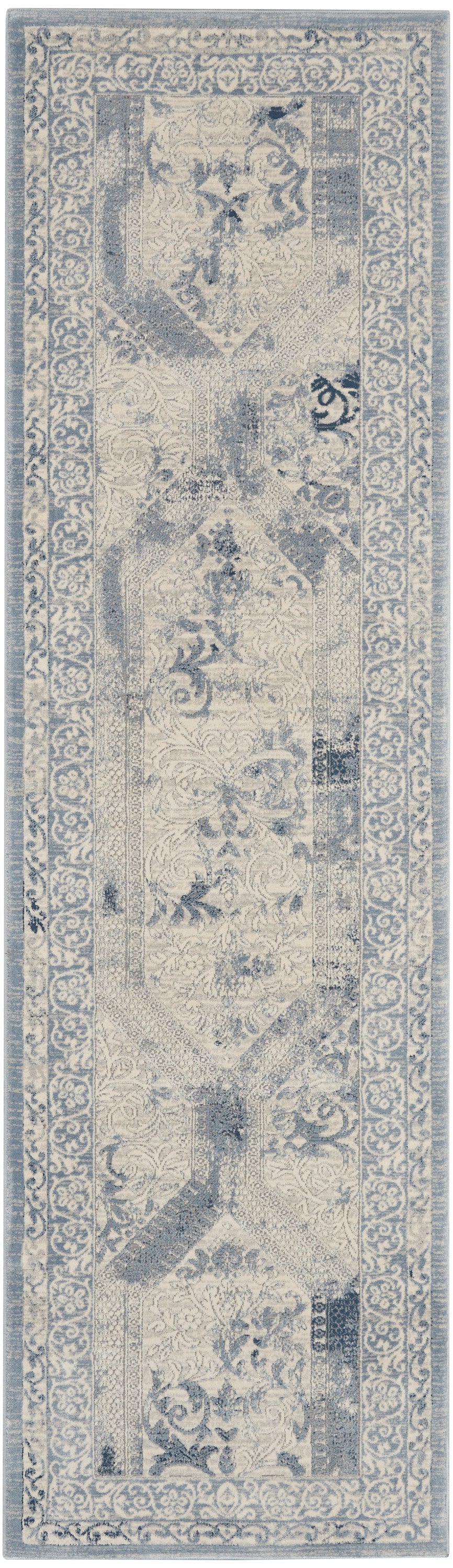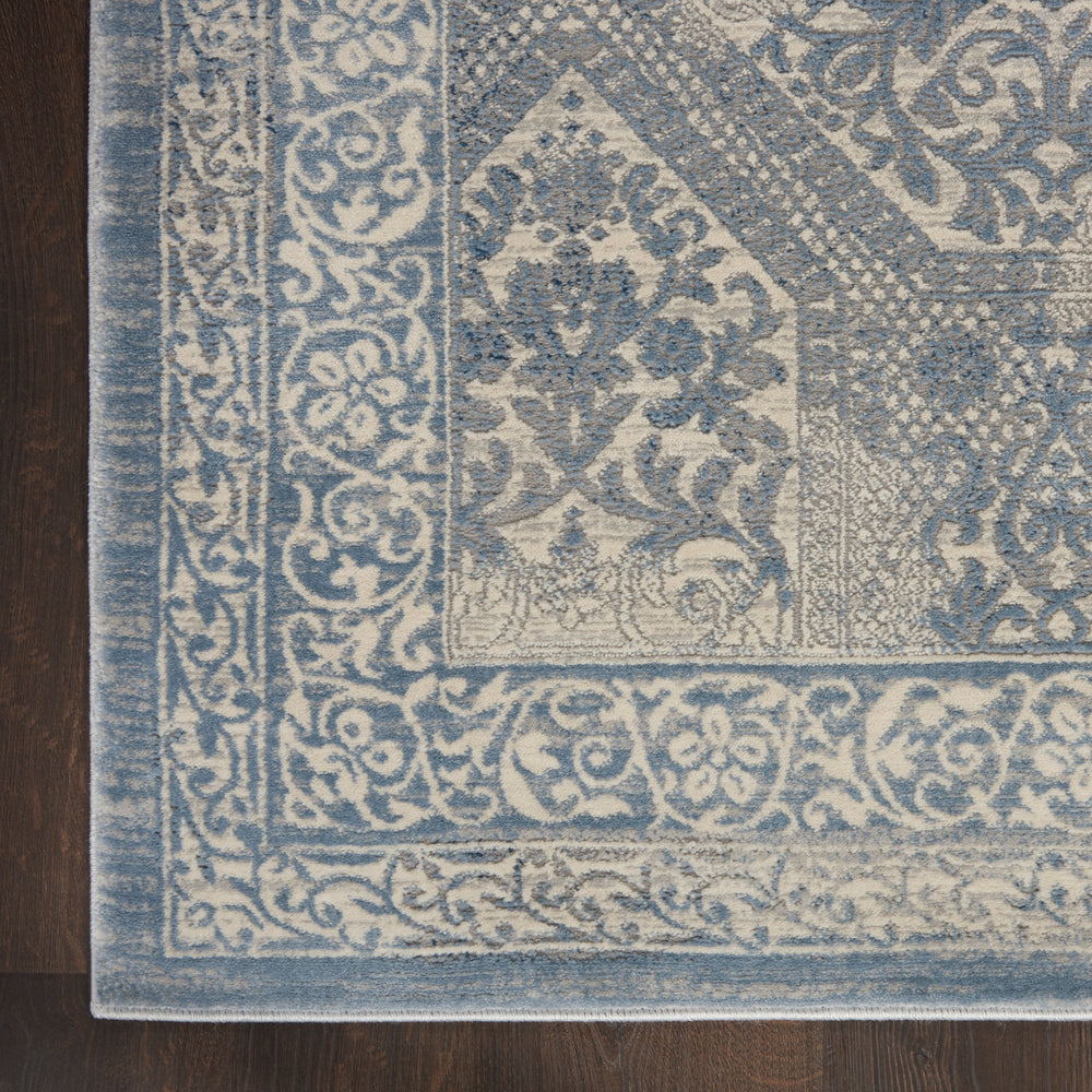 kathy ireland® Home takes the design elements of a traditional vintage rug and transforms them into a contemporary Grand Expression statement piece. Subtle distressed effect with carved detail creates a richly modulated surface. An excitingly versatile decorating choice in soft blue and ivory, in an easy-living poly-fiber blend.