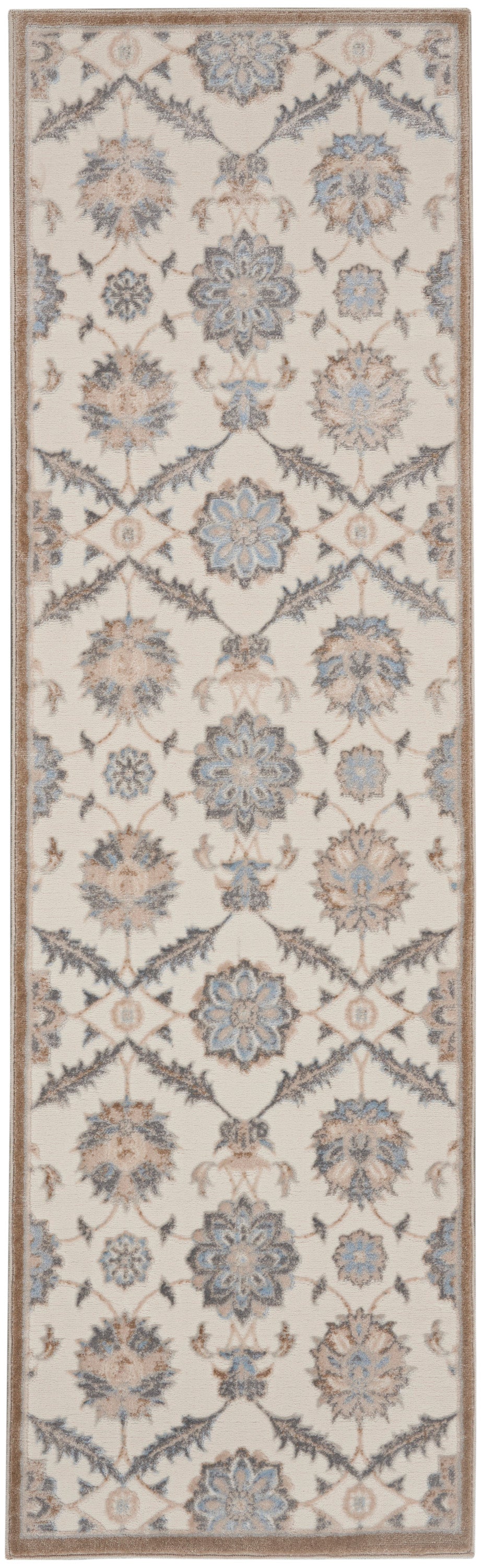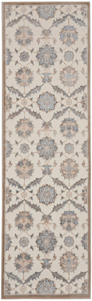 Indulge your taste for opulence with the fresh, creamy palette of this kathy ireland® Home Grand Villa area rug. Its framework of vines encloses imaginative blossoms for a statement of refined beauty. Simple narrow border and serged edge make it versatile decorating element.