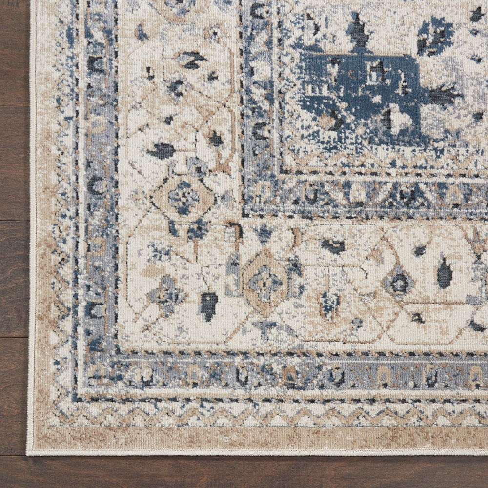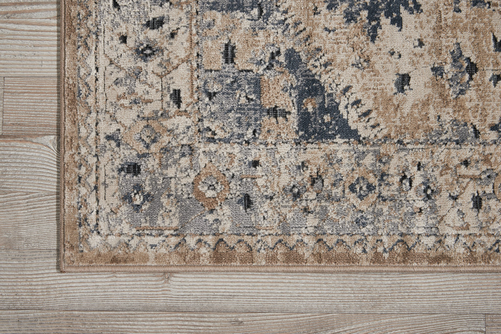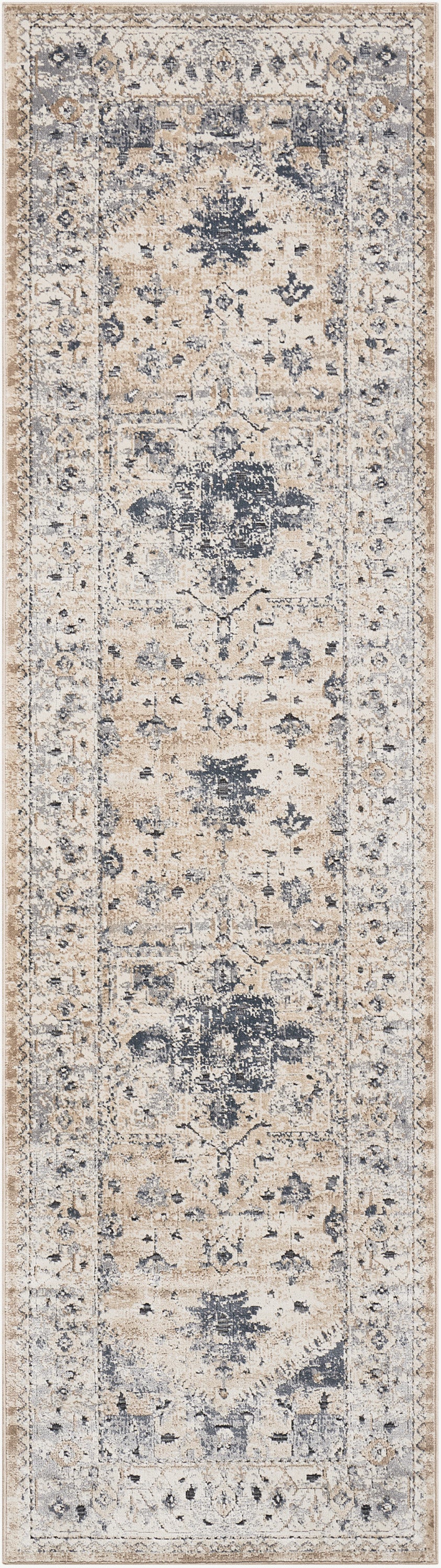 With its striking central motif and spectacular geometric botanical designs in gilded shades of beige, gold, blue and ivory, this magnificent rug is completely captivating. Marvelously washed to simulate the look and feel of a priceless antique, our kathy ireland® Malta runner rug is destined to be passed down to future generations and lives in our Ivory Coast Style Guide.