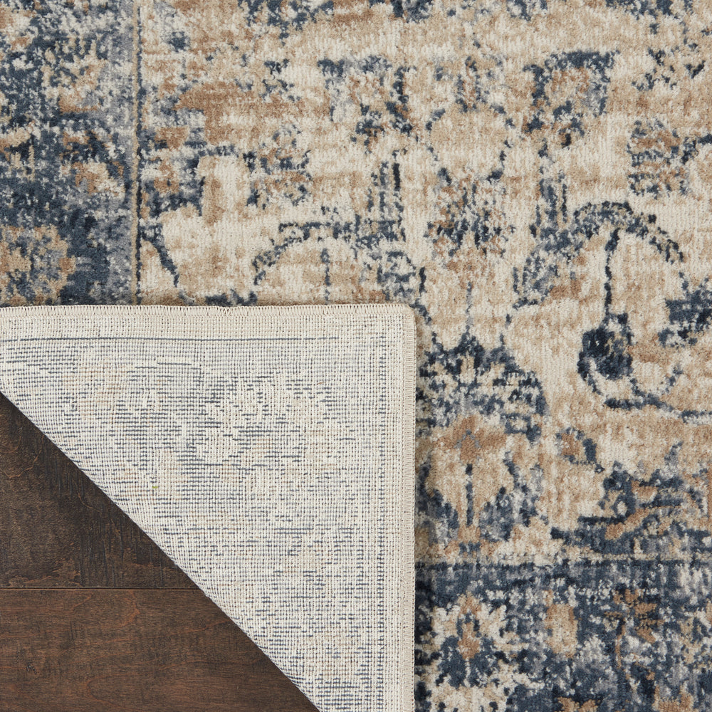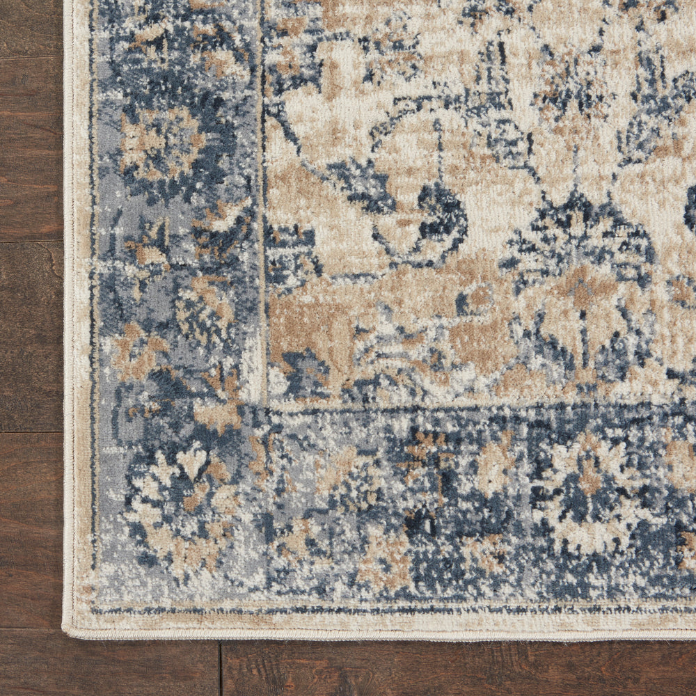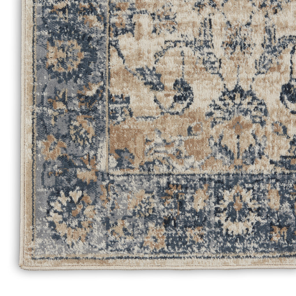 Exuberant stylized flowers bloom in glorious profusion across the field and lush border of this delightful Malta Collection rug by kathy ireland Home. Created in the Persian tradition, its delicate tones of ivory and blue fade to an antique finish for a timelessly elegant look. Power loomed from modern fibers for lasting beauty.